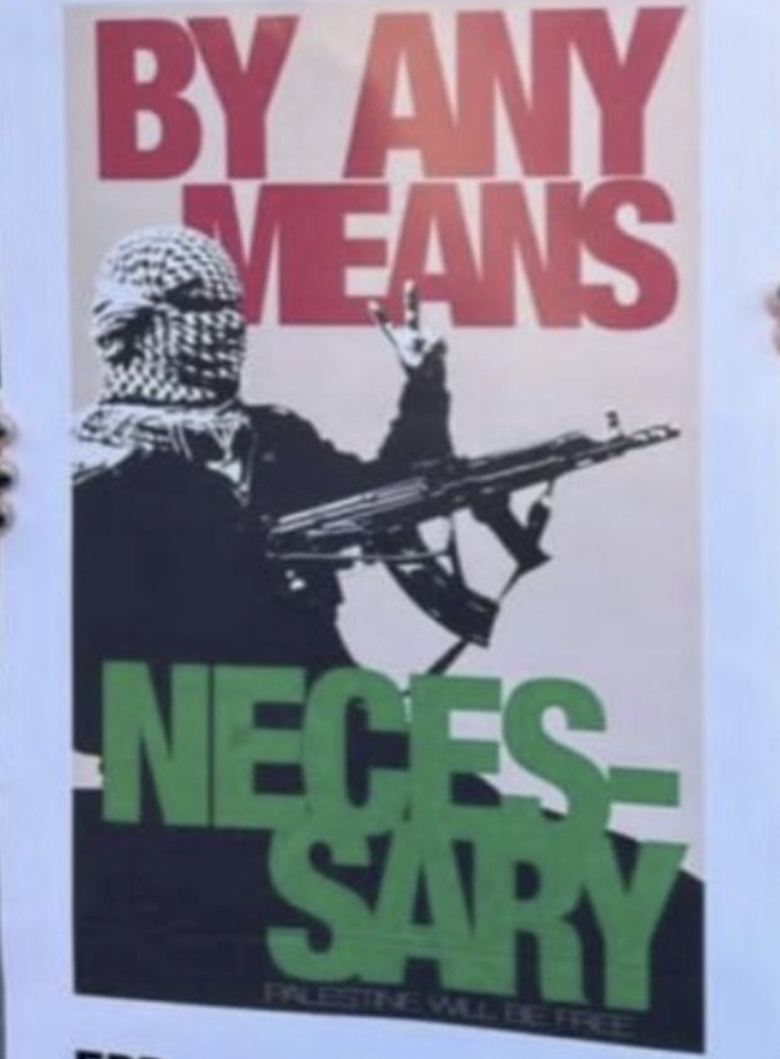 The iconography of the poster-the scarf, the color scheme - evokes Palestinian nationalism. Presumably the "end" to which the gun is the "necessary means" is Palestinian aspiration. (7/x)