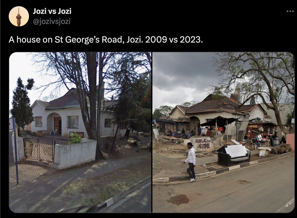 Take, for example, these pictures of a street in Johannesburg. On one hand, it is entropy, the absence of order (maintenance) leading to decay. On the other, it is evident in America. What are the shantytowns of California, the homeless encampments of the Bay area, the decaying neighborhoods of Baltimore and Detroit, but Johannesburg with more drugs?