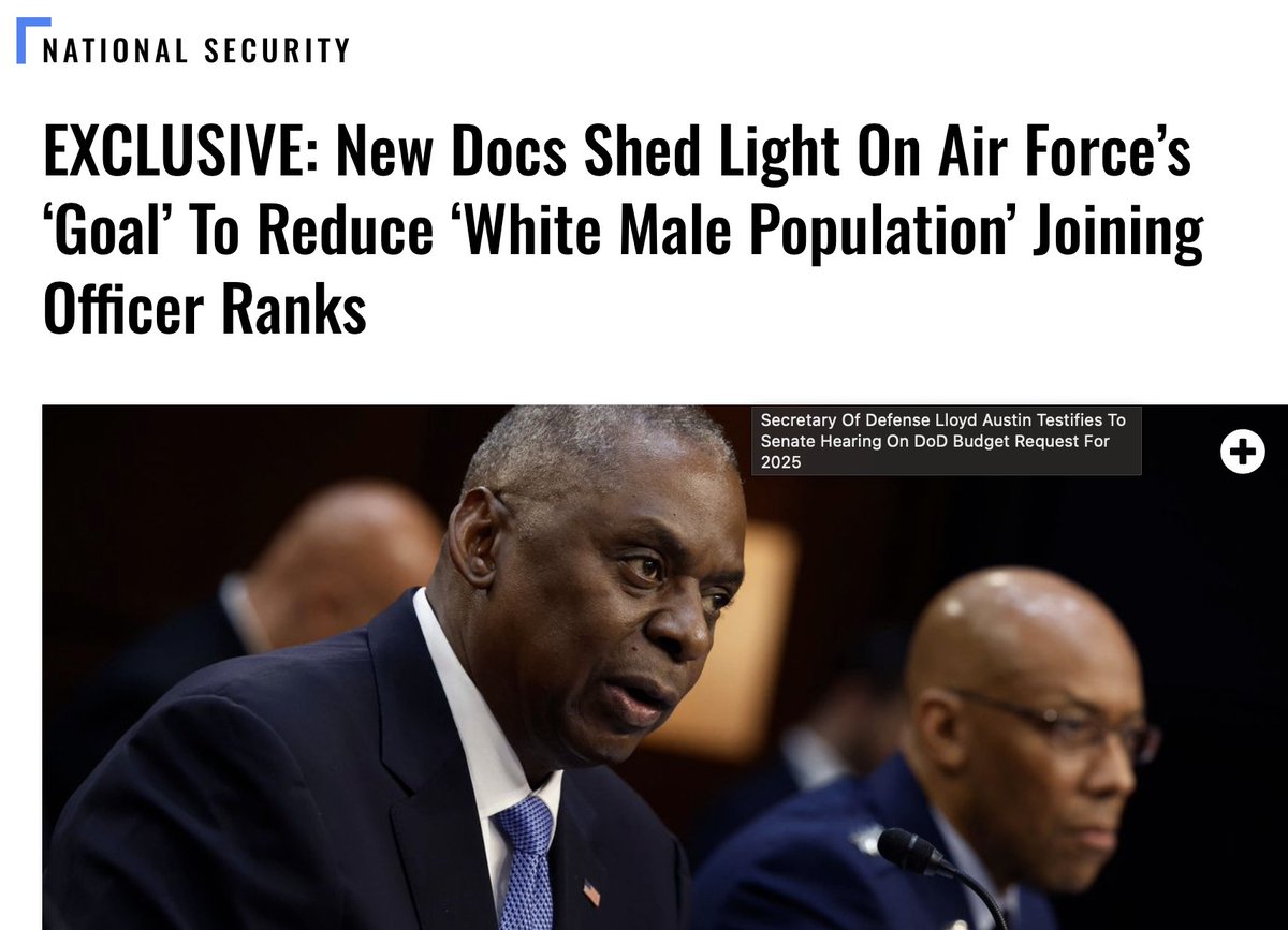 You get the USAF trying to reduce the number of white guys in its training programs. As The Daily Caller reported: “The Air Force finally handed over a trove of documents pertaining to its sweeping 'goal' of reducing the number of white male applicants in a popular officer program after spending months stonewalling requests for their release.”