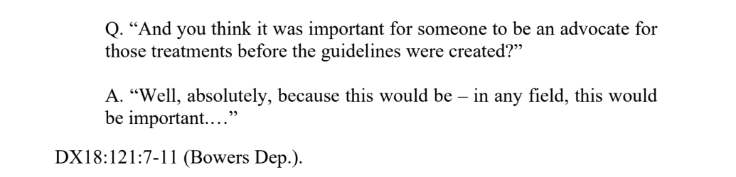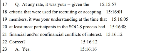 6/ On the critical question of conflicts of interest in SOC8's development, Coleman admits that he knew “at least most participants in the SOC-8 process had financial and/or nonfinancial conflicts of interest” when the guidelines were being developed. (Doc. 557-21, deposition of Coleman)