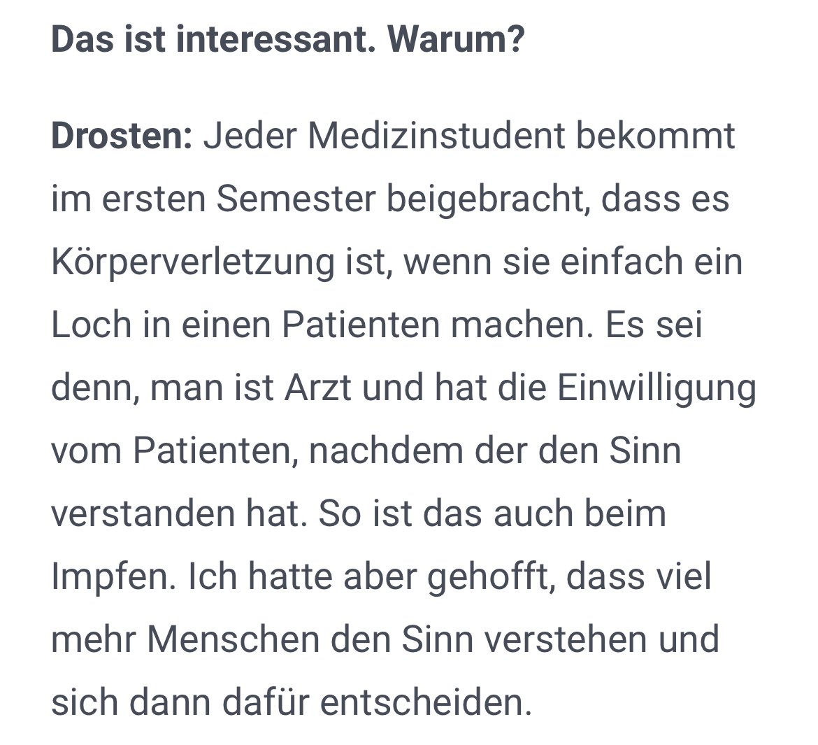 @tonline @jbebermeier @AnnLei1 9/ „Jeder Medizinstudent bekommt im 1. Semester beigebracht, dass es eine Körperverletzung ist, wenn sie einfach ein Loch in einen Patienten machen. Es sei denn, man ist Arzt und hat die Einwilligung v. Patienten, nachdem der den Sinn verstanden hat. So ist das auch beim Impfen.“