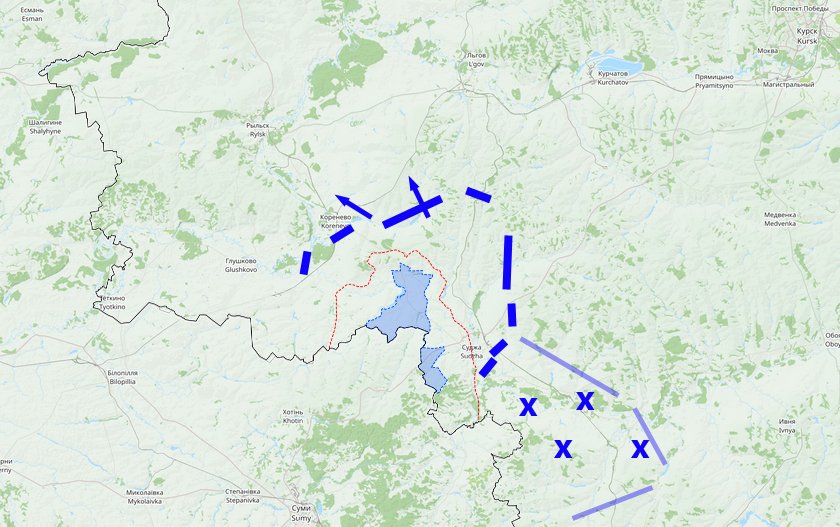 Zumindest ist seit dem Angriff am 10.8. abends keine größere UA Aktion mehr bekannt geworden. Anstatt die RU Position um Korenewo mit Spähtrupps im Rücken unhaltbar zu machen, scheint man frontal anzugreifen, was unsinnig wäre.
