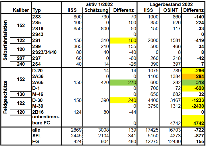 Markant ist, dass der geringere Lagerbestand an 2A65 durch den höheren Bestand aktiver Geschütze in etwa ausgeglichen wird - hier wurden offensichtlich bereits vor Kriegsbeginn Geschütze reaktiviert, wie es sich iÜ auch ähnlich bei den Kampfpanzern für die T-80 zeigen lässt.