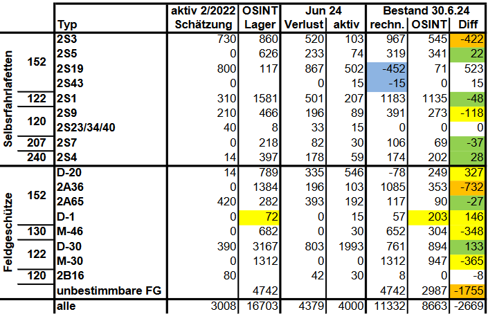In Tab. 2 wurde die Zahl aktiver Geschütze pro Typ aus dem Verlustverhältnis von Jun/Jul geschätzt. der rechnerische Lagerbestand zum 30.6.2024 ergibt sich aus der Differenz aktiv+Lager 2022 abzüglich Verluste bis 6/2024 und aktiver Bestand zum 30.6.