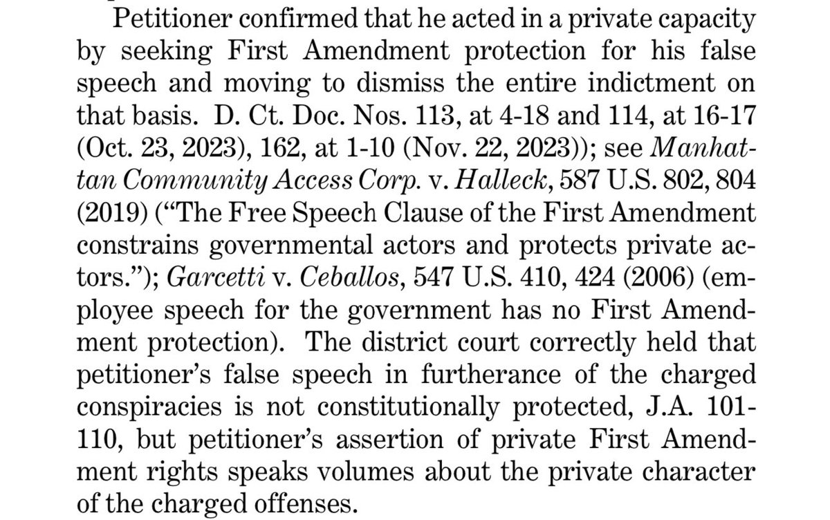 Notice Trump argues he has a First Amendment right to make his Ellipse speech. But Jack Smith reminded us in his immunity brief to SCOTUS last year that the First Amendment protects PRIVATE CITIZENS, not the government. 2/