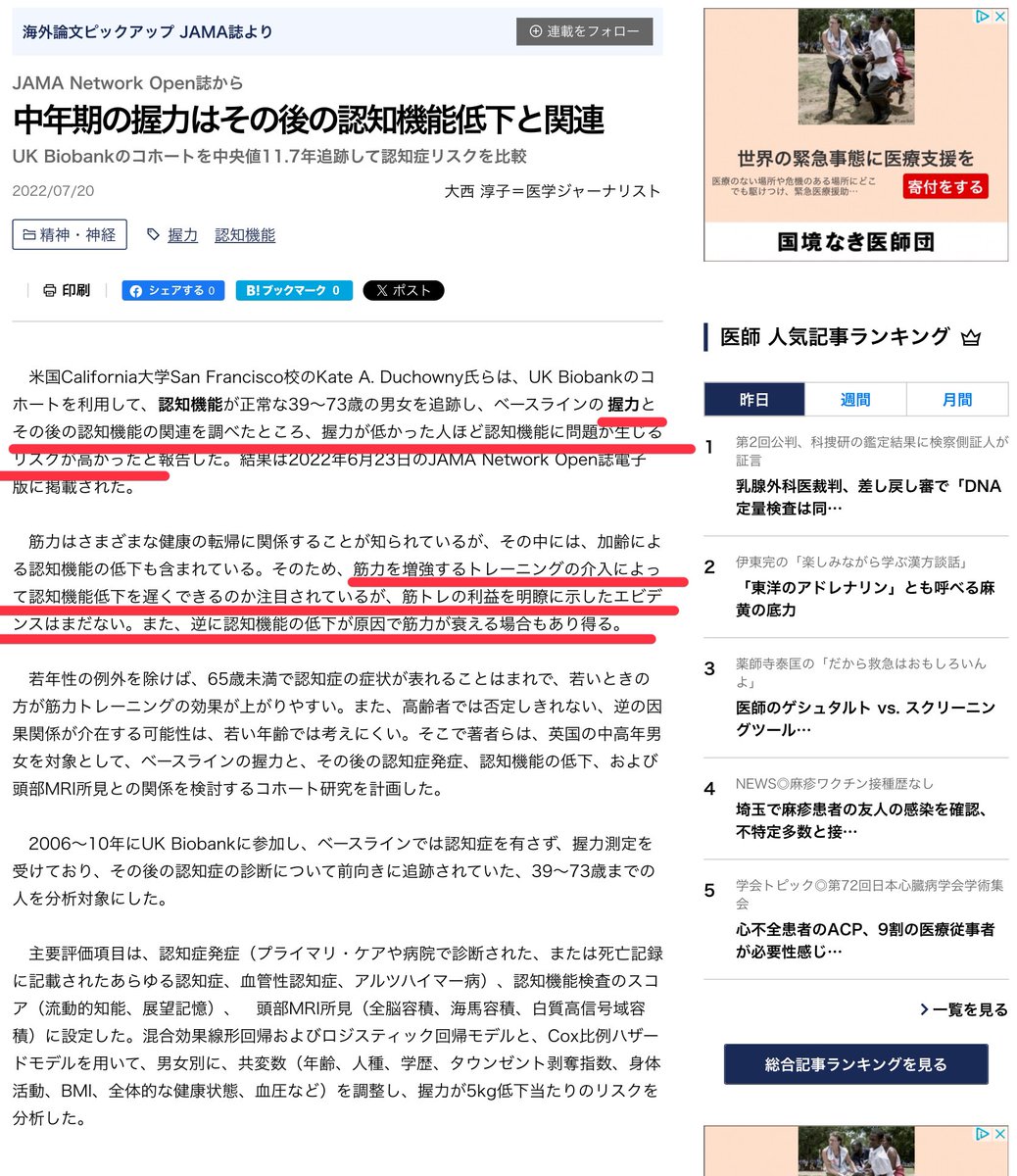 そして握力が低いと、認知機能に問題が生じるリスクが指摘されています。
