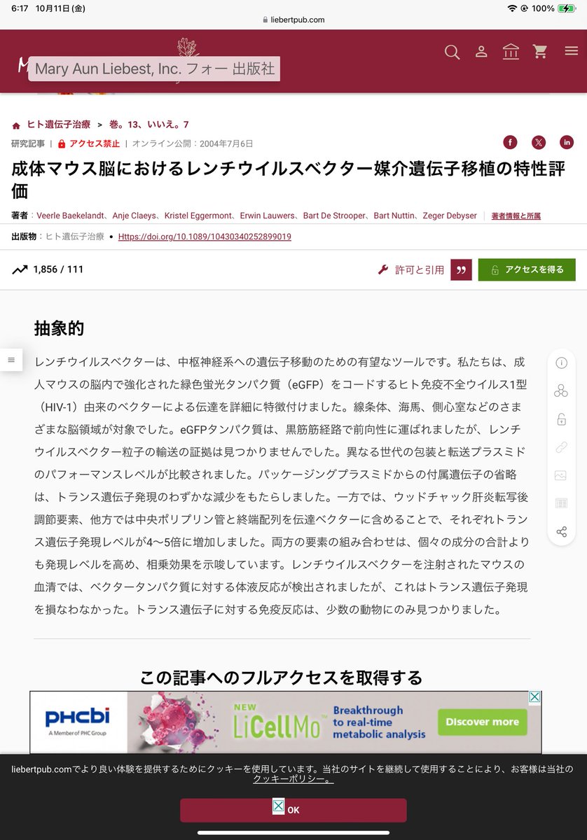 「レンチウイルスベクターは中枢神経系への遺伝子移動のための有望なツールです。」 liebertpub.com/doi/abs/10.108…Image