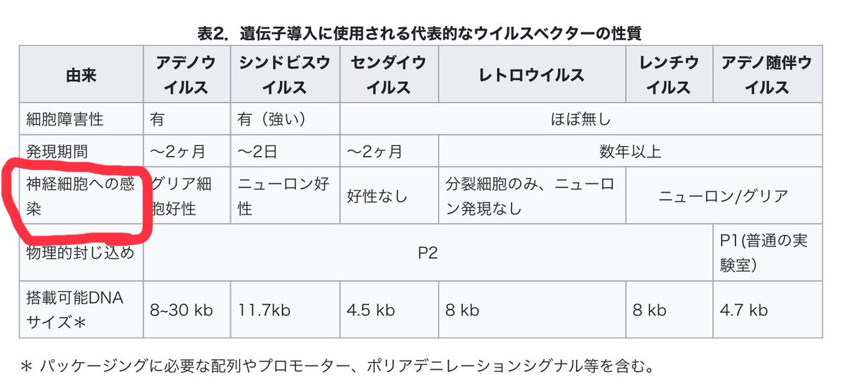しかし、この表にはベネズエラ馬脳炎ウイルスベクターのような、中枢神経好性のベクターは載っていません。