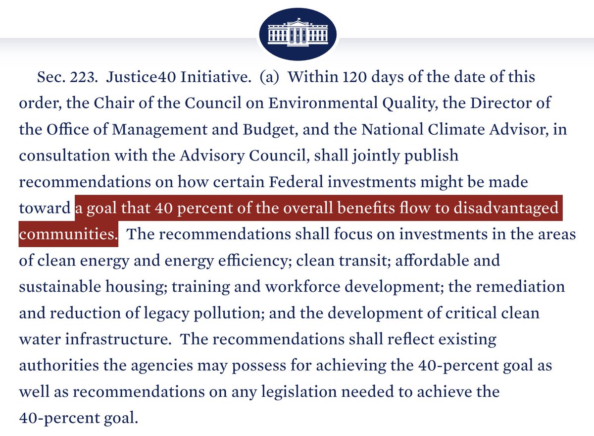 Their initiative, “Justice40,” directs “40% of the overall benefits of federal investments from covered programs" to “disadvantaged communities.”