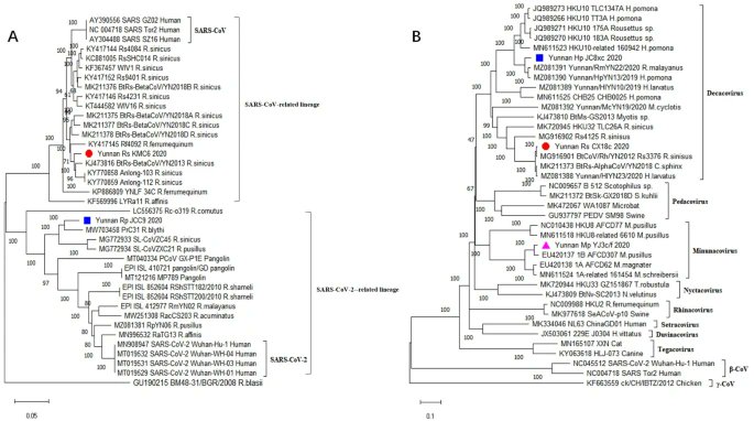 2) This study examined coronaviruses in bats from Yunnan, China. Researchers found 7 new coronaviruses, including 5 alpha-coronaviruses and 2 beta-coronaviruses. Genetic analysis revealed unique features in these viruses, like additional genetic segments.