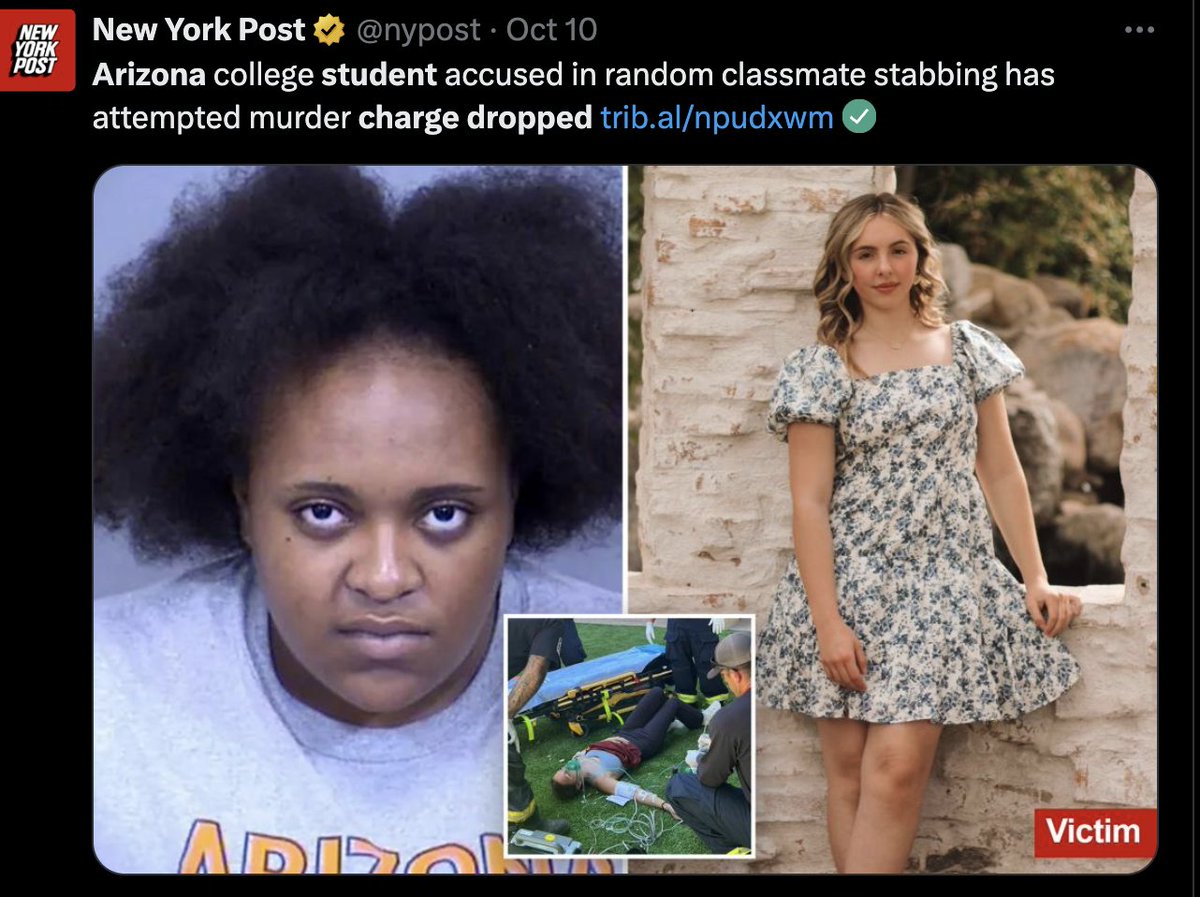 Then there's the "fellow classmate" who stabbed another student, almost to death, merely because she could. She said the other student, the white girl, looked like an easy target