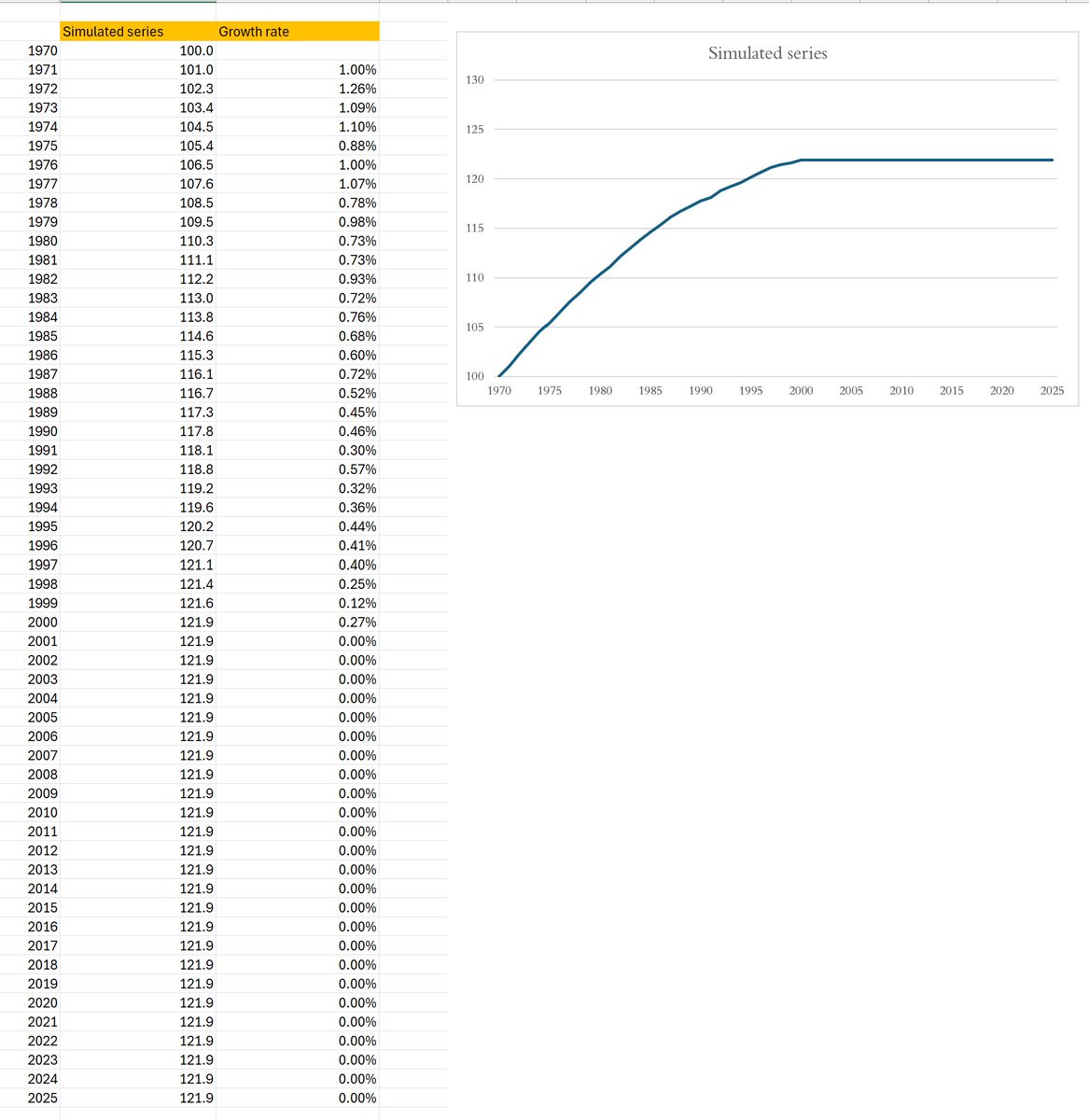 OK, then let’s simulate a series. Suppose the starting point is 100 in 1970, and the growth rate gradually fades — from 1% per year in 1971 to 0% in 2001. I assume the growth rate declines by 0.03% per year (plus a small random shock). Here’s the simulation in Excel. 3/N
