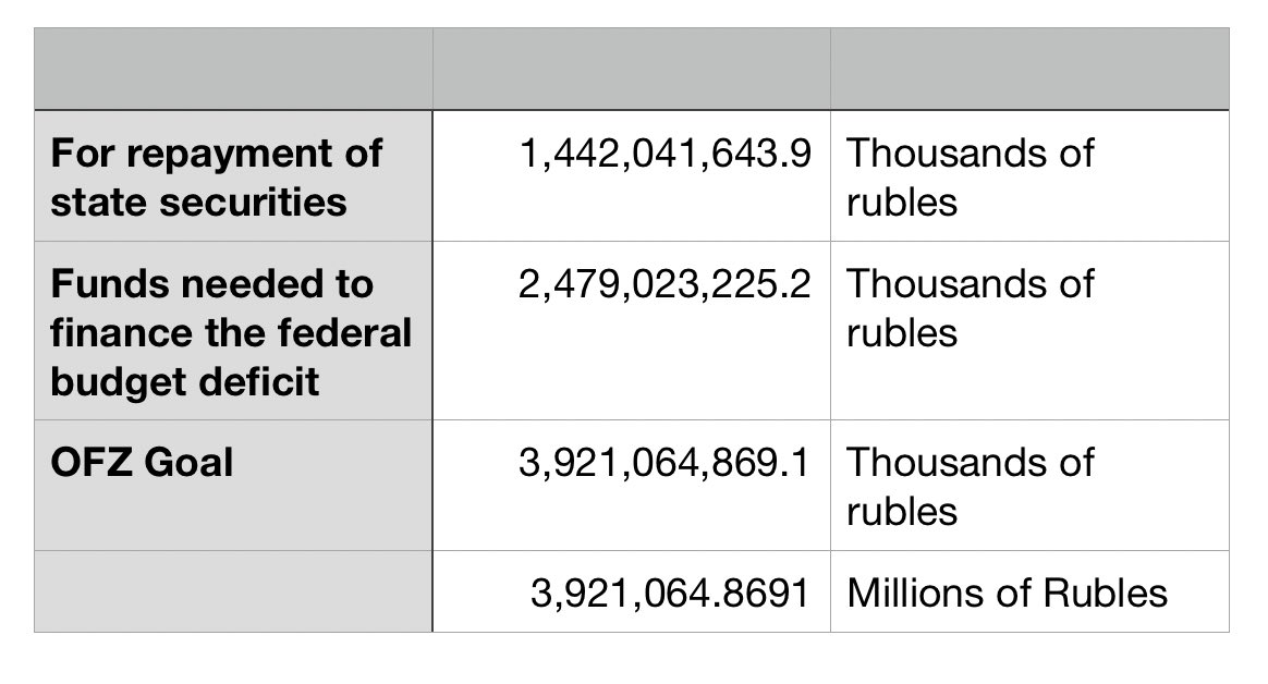 The Ministry of Finance announced they were creating 5 new bonds totaling 4.25 Trillion Rubles.