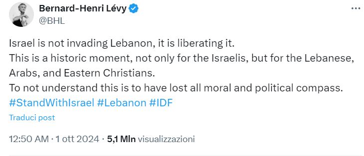 Il "nuovo" suprematismo cretino & suicida, parliamone... Qua abbiamo un post del filosofo Bernard-Henri Lévy e un estratto del pezzo del giornalista Stefano Folli. Da una parte uno che vuole portare la "liberazione occidentale" alle popolazioni mediorientali, dall'altra uno