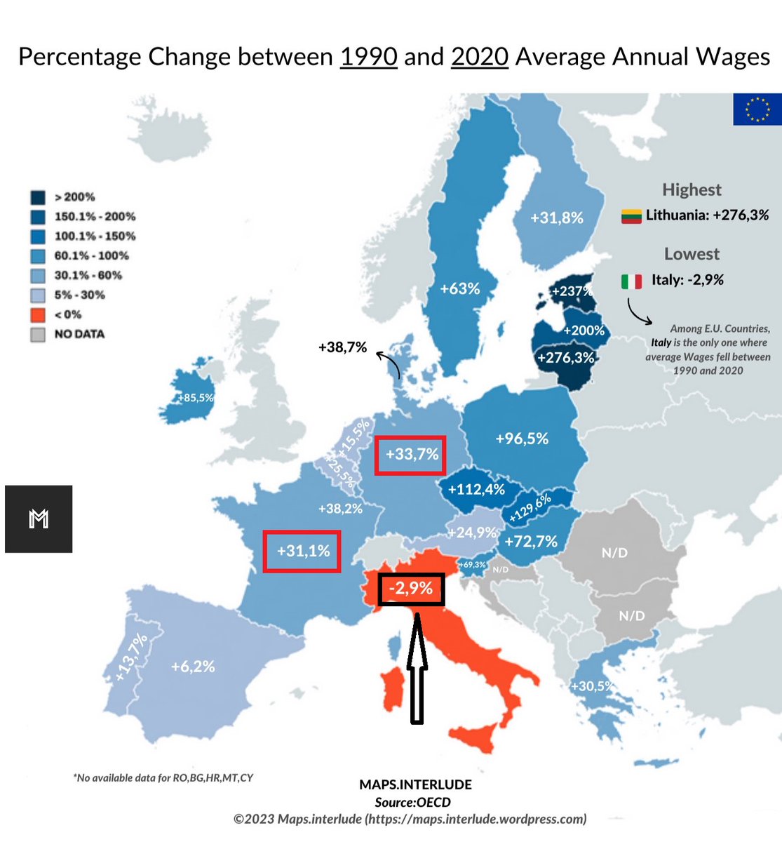 Salari italiani mediamente al palo da decenni, ma zero reazioni sostanziali & decisive. Questo grafico, o altri grafici con numeri simili, sono stati molto condivisi sui social negli ultimi mesi. Ma come sempre, dopo il brevissimo furore
