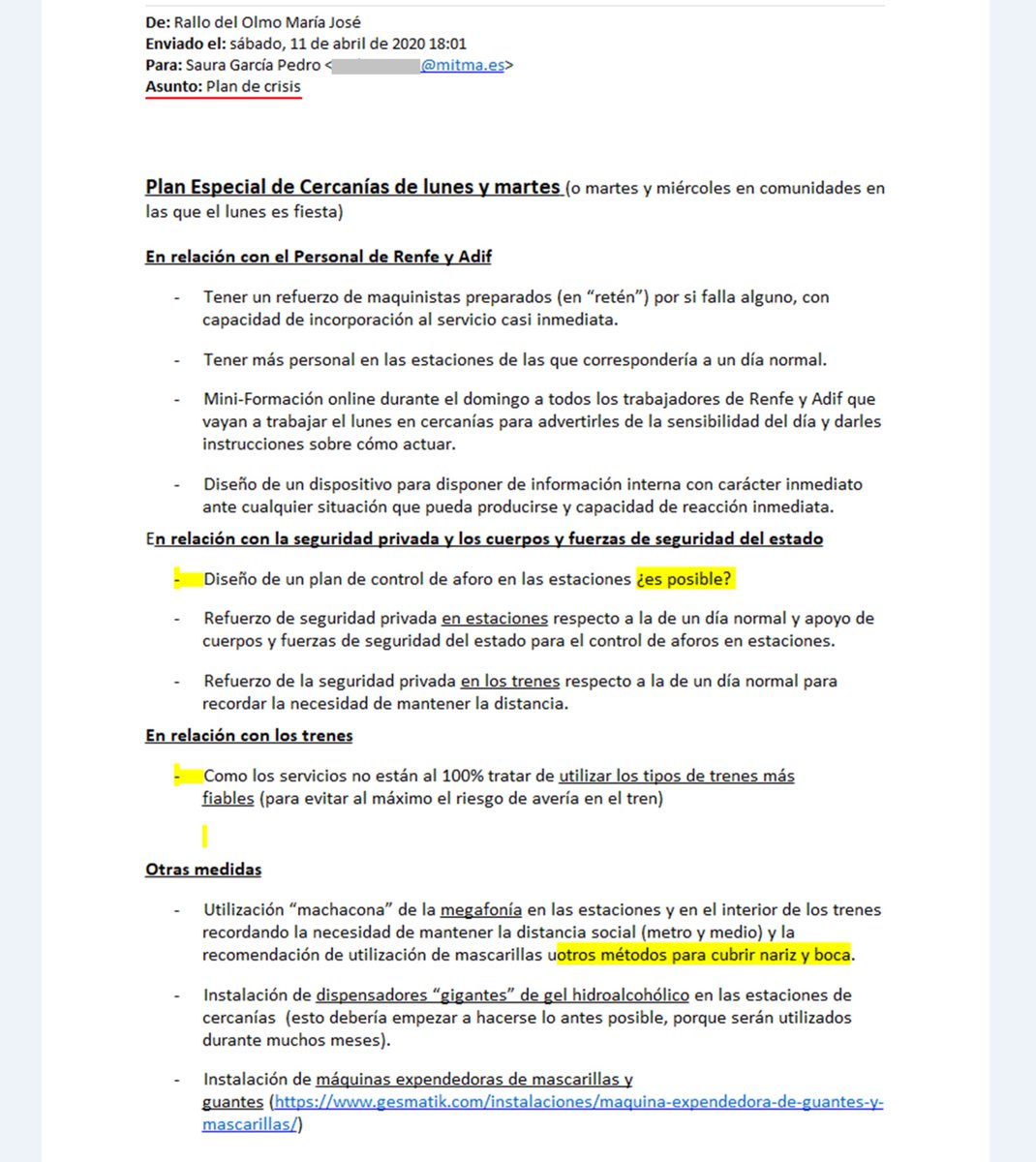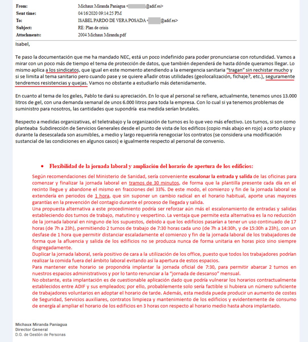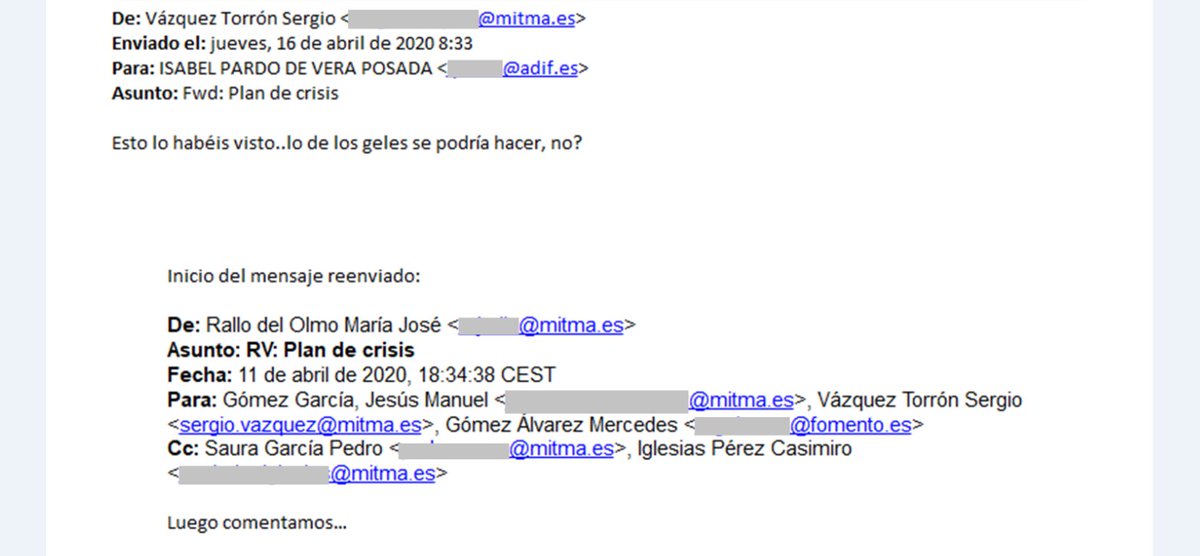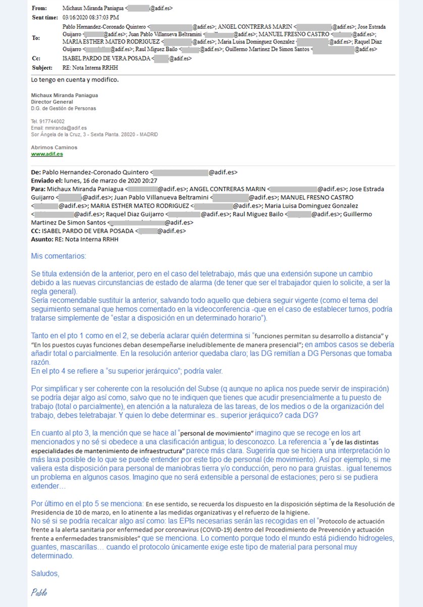 (2/8) Uno de los imputados en el #CasoKoldo Michaux Miranda Paniagua, inicia una cadena de emails a todos los altos cargos de ADIF, inventándose un plan de restricciones para el estado de alarma e invitando a los demás a que vayan incluyendo sus ocurrencias.