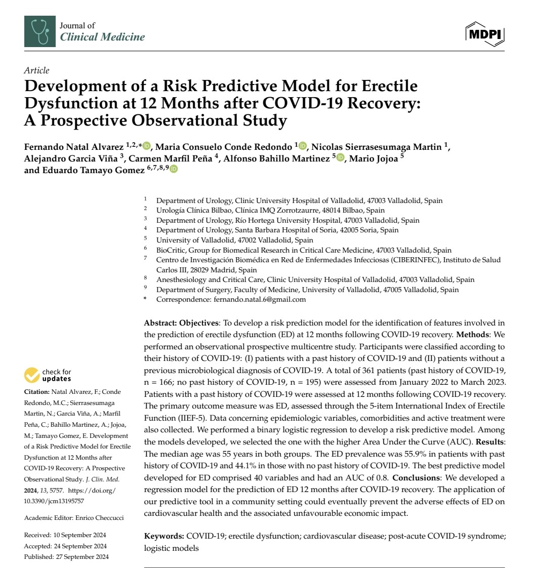 "Development of a Risk Predictive Model for Erectile Dysfunction at 12 Months after COVID-19 Recovery: A Prospective Observational Study" mdpi.com/2077-0383/13/1…