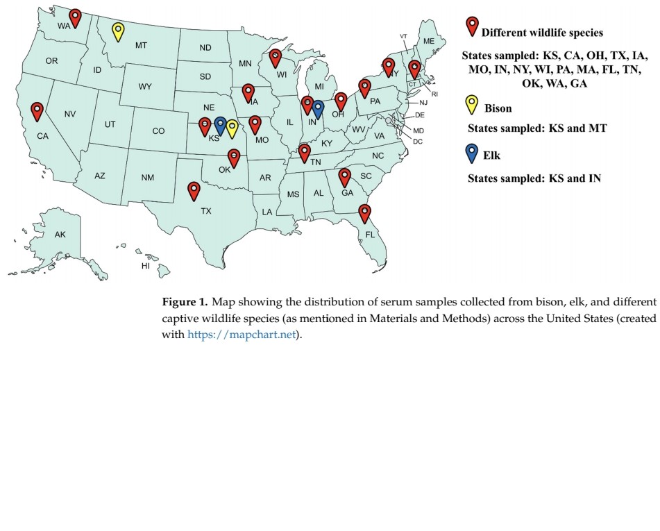 2) This study investigated SARS-CoV-2 seroprevalence in bison, elk, and captive wildlife across the U.S. using ELISA and virus neutralization tests. Results showed 1-4% of samples had antibodies to SARS-CoV-2 proteins, with neutralizing antibodies detected in bison, elk, cheetahs
