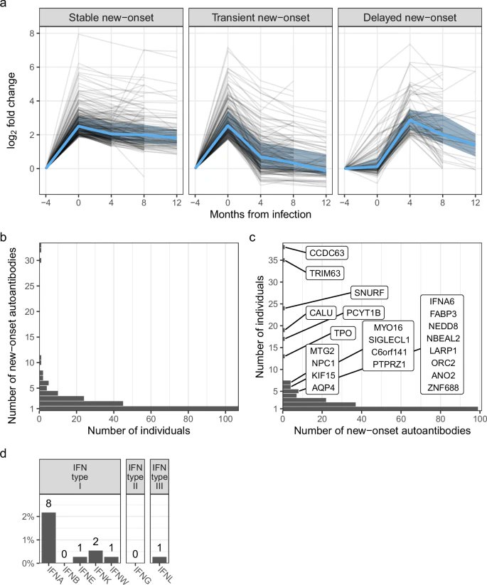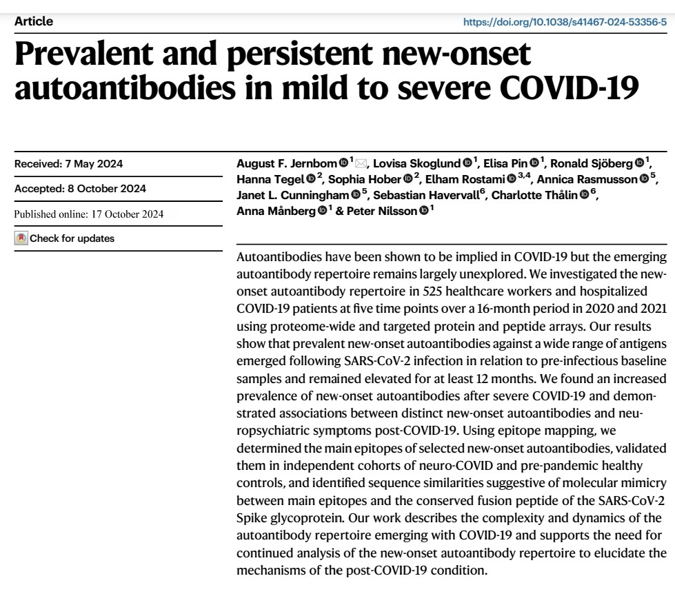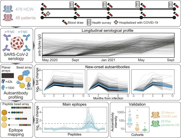 2) This study examined the new autoantibodies that develop in people with COVID-19. The results show that many new autoantibodies targeting diverse proteins appear after SARS-CoV-2 infection and last for over a year.