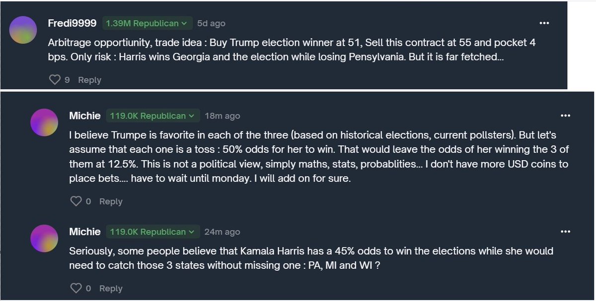 Small sample of comments below -- one where he suggests you can arbitrage Pennsylvania & the general election. And one where he implies each state is an uncorrelated independent event. You can see the uncommon spacing around punctuation which strongly implies a French speaker. The French also use ellipses much more than other languages utilize them.