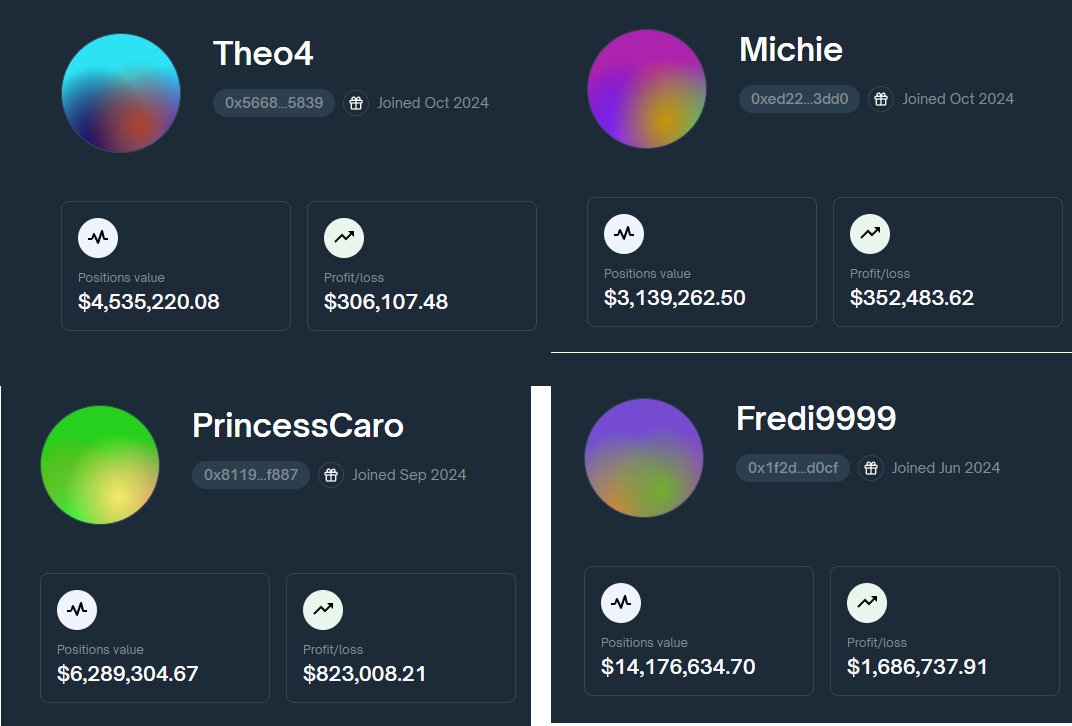 How'd I get to $25m? Because Fredi is not just loading up his account and making bets. Fredi9999 is, I believe, creating new Polymarket accounts so it doesn't look like a single trader. Fredi9999 the OG account, second account PrincessCaro, third account Michie, and the most recent account Theo. Mark-to-market, the accounts have $28m in positions from those $25m in bets.