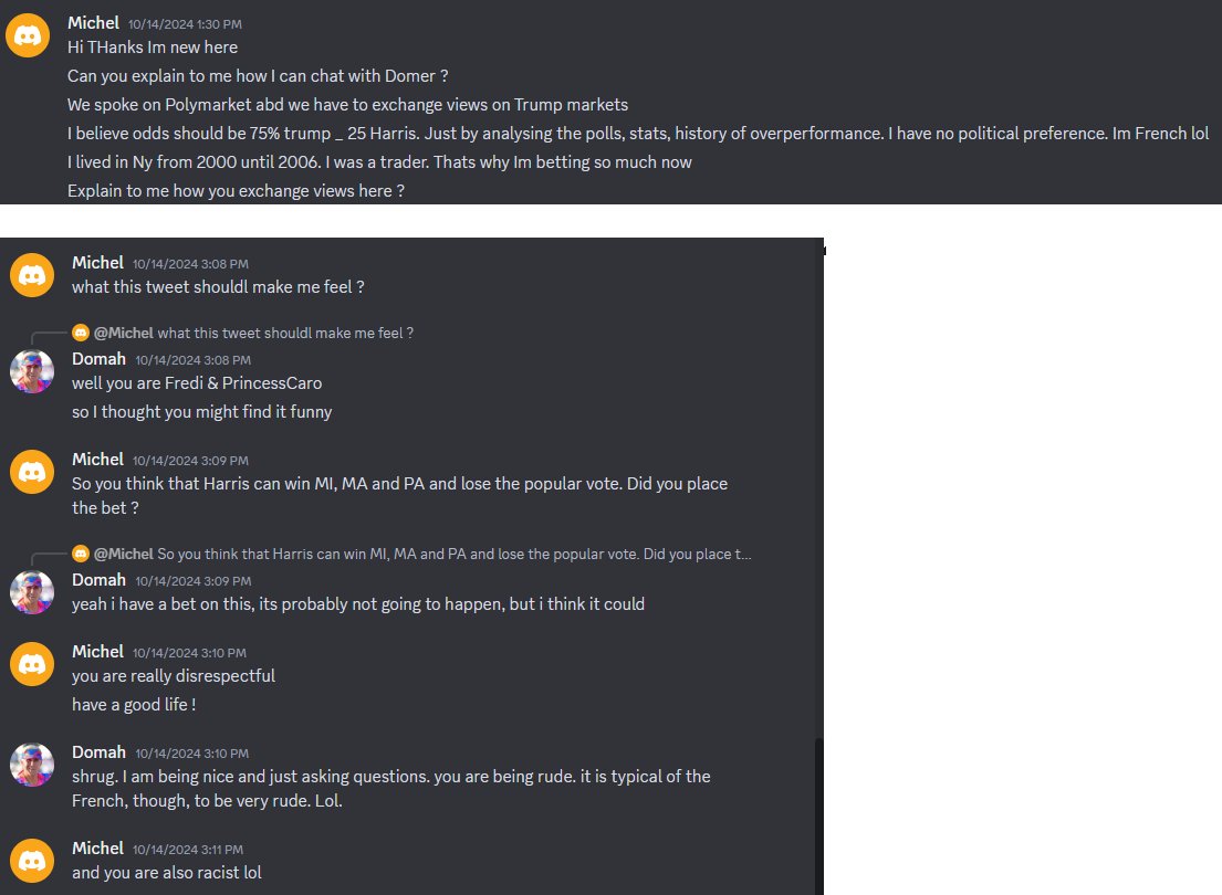 After a few days, he acquiesced and created a brand new Discord account to talk with me. He joined the Polymarket discord and gave his biography for unclear reasons in a channel that no one uses.