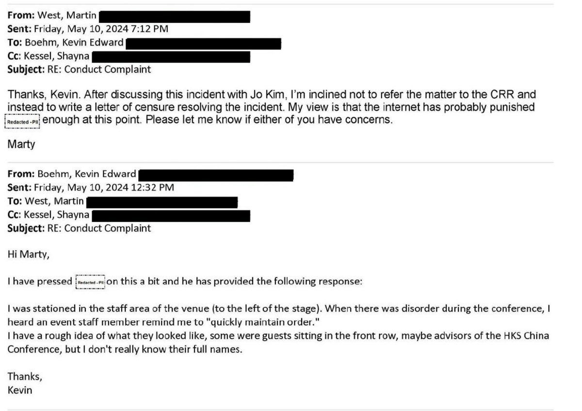 The exchanges also indicate that Zou told Boehm that he had been instructed to "maintain order" by an "event staff member," whom West and Boehm could not identify, and that Zou "accompanied" Wu "to meet nearby campus security personnel."