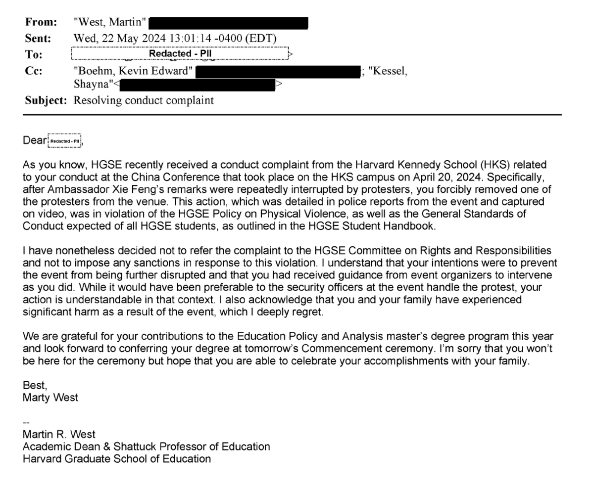 Zou had violated Harvard's "Policy on Physical Violence," Harvard told him in an email. But the academic dean of the education school, Martin West, had decided "not to impose any sanctions in response to this violation"—in part because of the blowback Zou had received online.