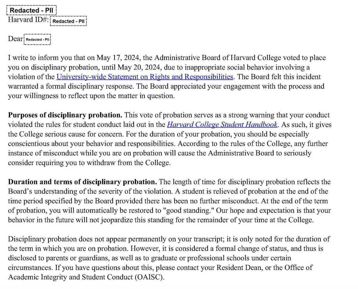 The line likely refers to letters of recommendation, which, per the Harvard College Handbook, "must always" mention "probation for disciplinary reasons."