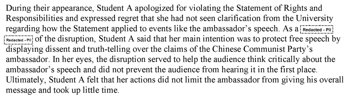 The committee noted noted in a May 17 report that she had apologized in a meeting with the board for disrupting the Chinese ambassador.