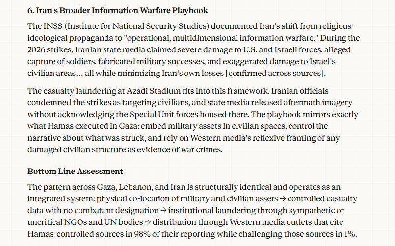The casualty laundering at Azadi Stadium fits into this framework. Iranian officials condemned the strikes as targeting civilians, and state media released aftermath imagery without acknowledging the Special Unit forces housed there. The playbook mirrors exactly what Hamas executed in Gaza... embed military assets in civilian spaces, control the narrative about what was struck, and rely on Western media's reflexive framing of any damaged civilian structure as evidence of war crimes.