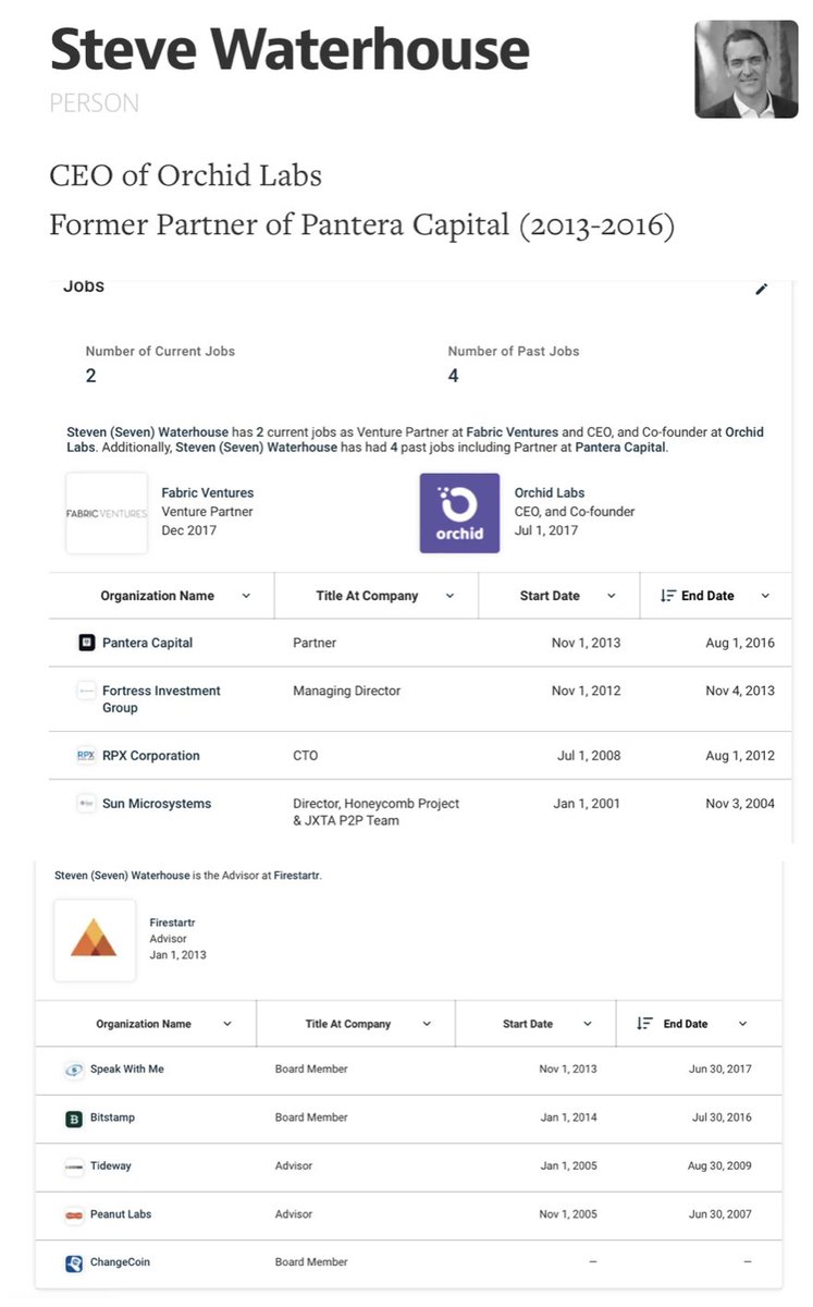 Steve Waterhouse, Director and team leader of Sun Microsystems, was also: Partner at Pantera with Jed McCaleb, CEO and founder of Orchid Labs with Paul Veradittakit, former Fortress Investment Group managing director, board member of Bitstamp and Change Coin. While at Pantera with Jed McCaleb, Steve invested in Chain, a company that would merge with Stellar’s Lightyear to form ‘Inter/stellar’. Several years later, Chain reverted back into Chain. Stellar allegedly retained all intellectual property from the partnership.