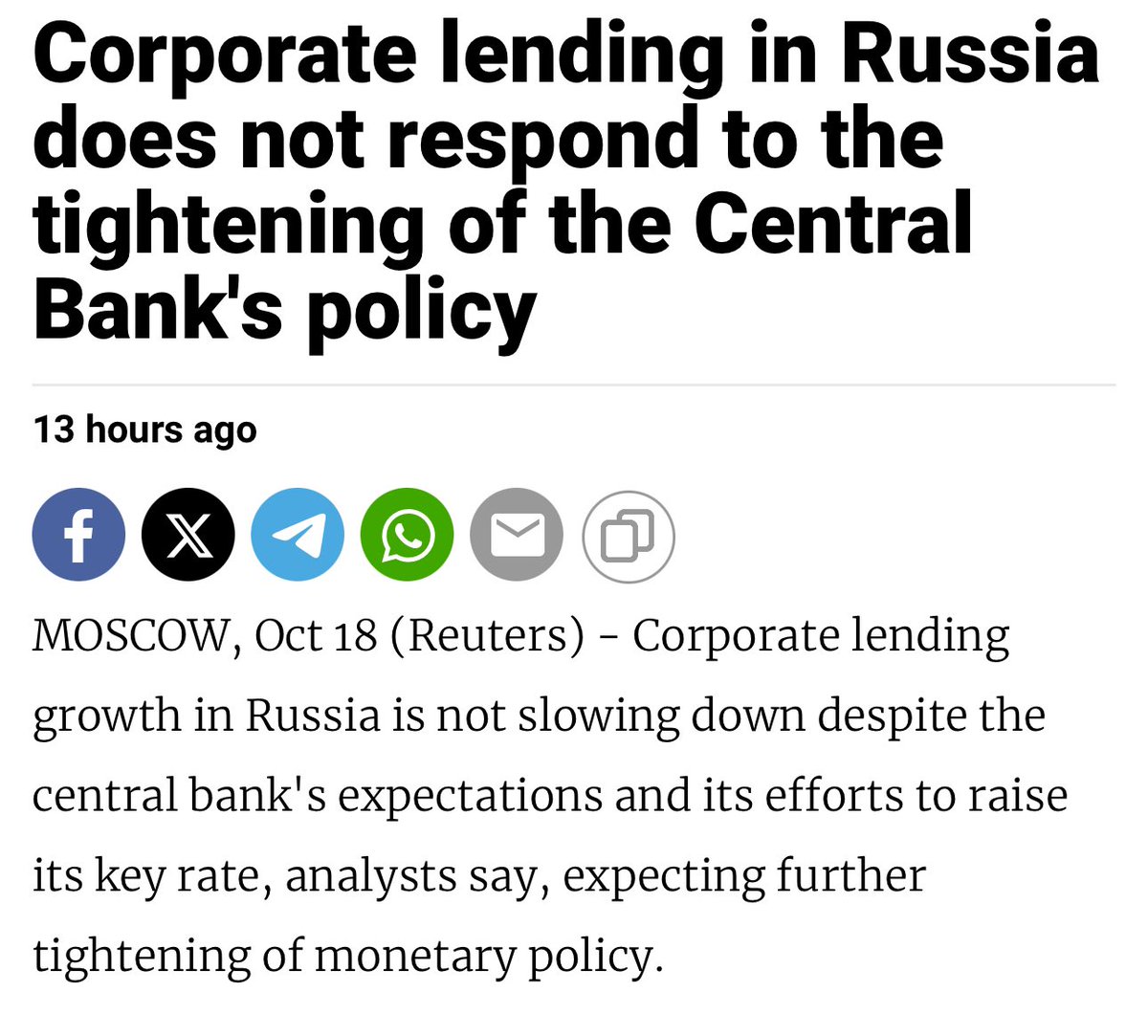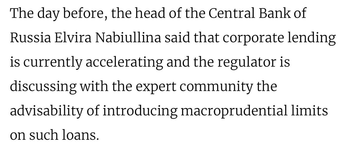 The “head of the Central Bank of Russia Elvira Nabiullina said that corporate lending is currently accelerating and the regulator is discussing with the expert community the advisability of introducing macroprudential limits on such loans.”