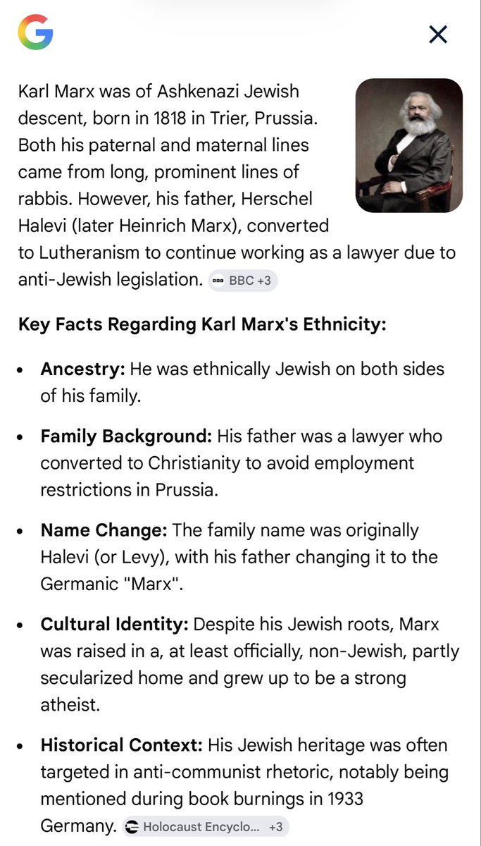 “Karl Marx (1818-1883) was a "German" philosopher, economist, and revolutionary socialist theorist born into an Orthodox jewish family with relations to several Rabbis.