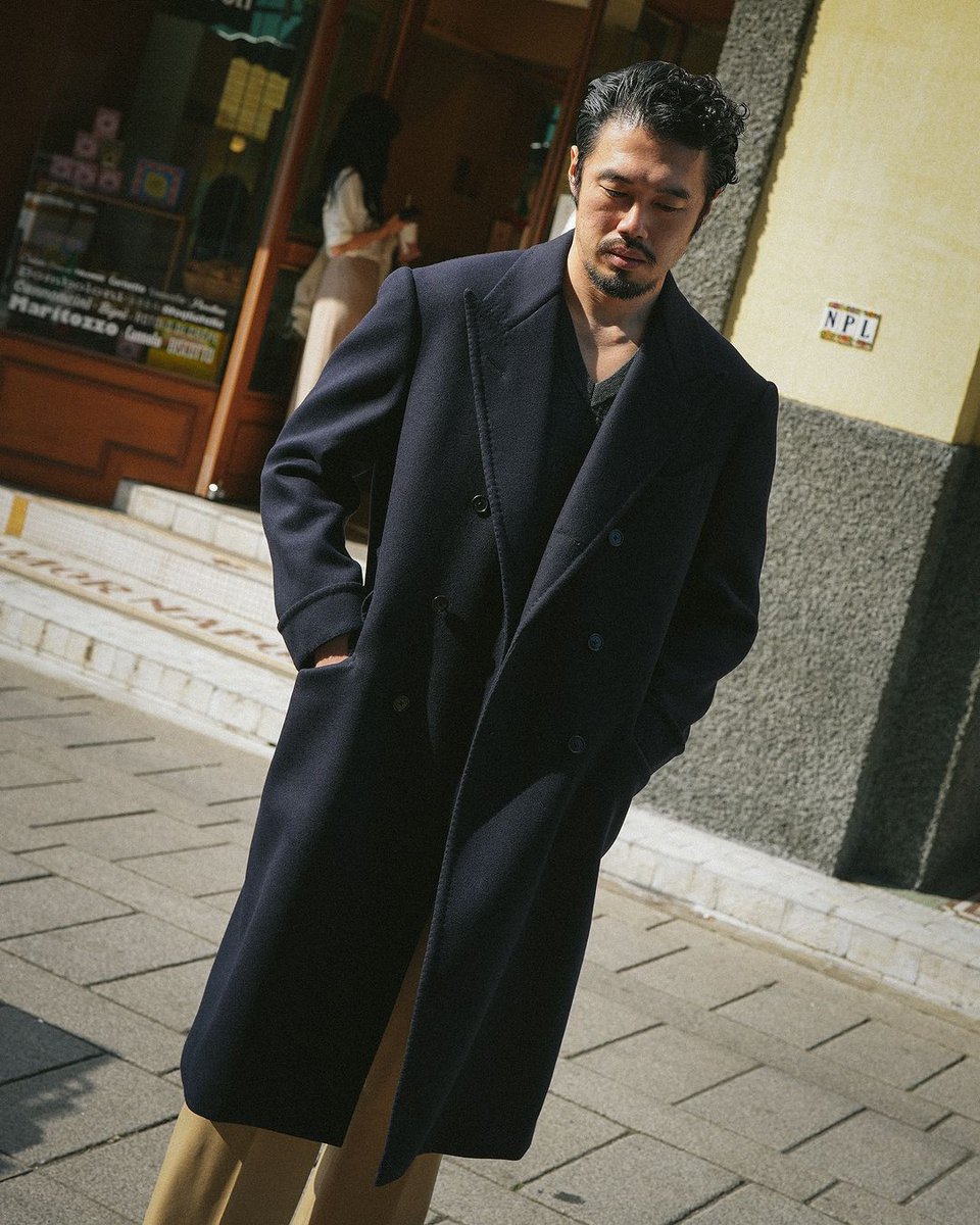 But the more important aspect is how the garment is constructed. This overcoat is made in the same way a suit jacket or sport coat would be made. It has an internal canvas, shoulder padding, and a wirey haircloth that shapes the chest. This how you get the shape in pic 2.