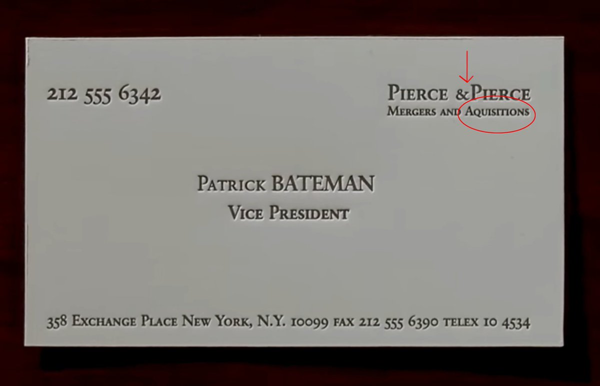 There are a number of things wrong with Bateman's card. First, it's missing a space in front of the ampersand and the word "acquisitions" is misspelled. This misspelling is present on all the cards in this scene.