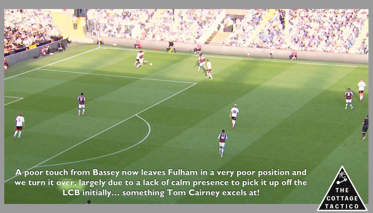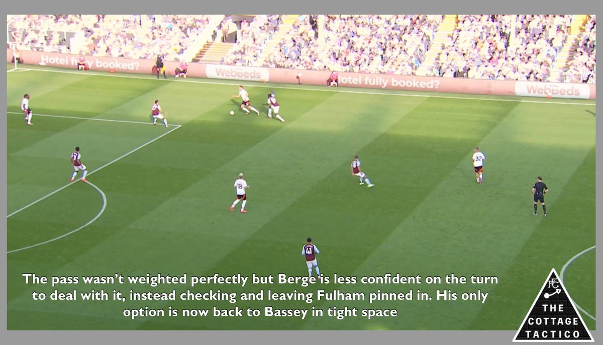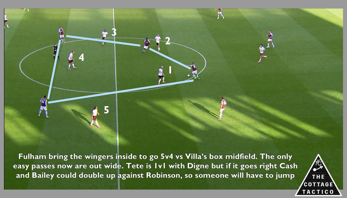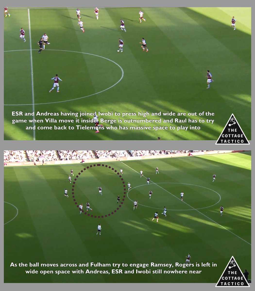 After Fulham overcommit the midfield is utterly exposed on two occasions as Villa draw attention one side then the other, to create wide open space centrally