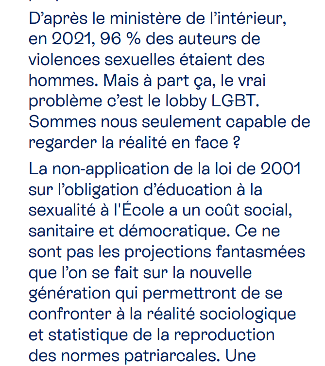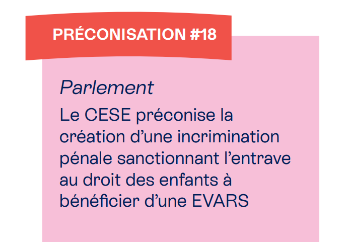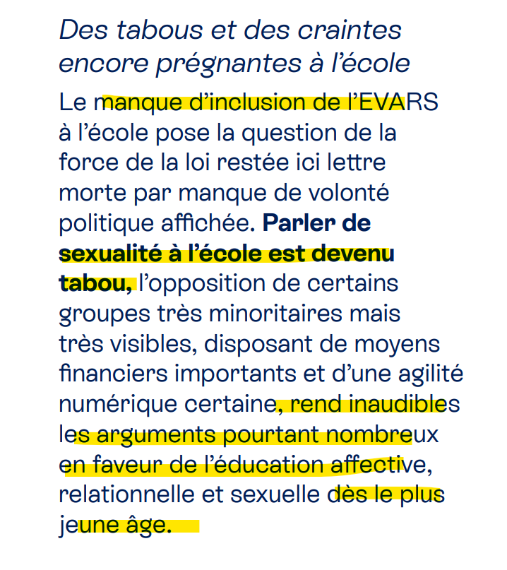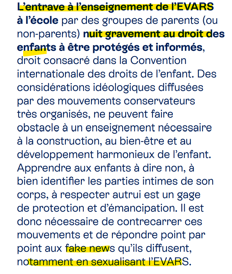 Et le CESE est très gêné que certains parents puissent s'opposer à l'éducation sexuelle, "notamment en la sexualisant" (quelle ironie). Le ton est très dur, il n'est pas possible de censurer ce cours ou de le remettre en question, il faut que chaque parent fasse confiance.