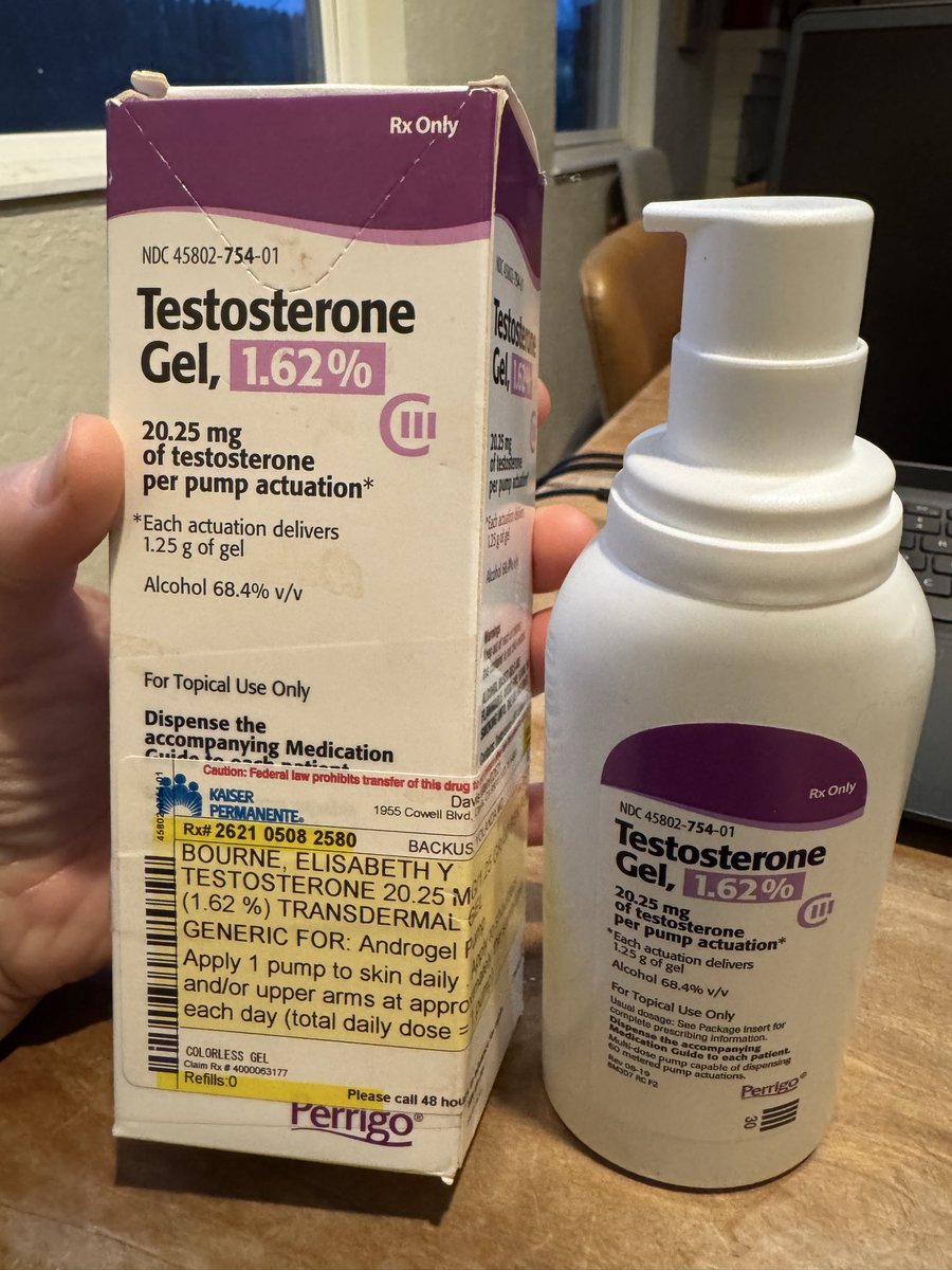 In under 25 minutes (one 13-minute online appointment and one 10-minute in person appointment with my primary care doctor, Dr. Yolanda Backus at Kaiser Permanente Davis), I was able to obtain a prescription for “gender-affirming” testosterone.
