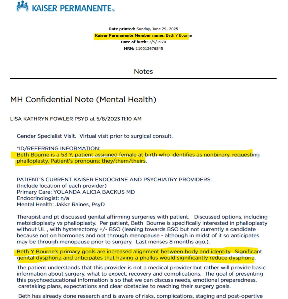 I wanted proof to show the world there was almost no stopping a trans-identified child from being medically "transitioned" at Kaiser Permanente once your child announced their trans 🏳️⚧️ identity. I wanted written records from the pediatricians in my town (Davis, CA) exactly what would be their protocol for medicalizing a child, and if there were any guardrails in place for parents like me who were not affirming.