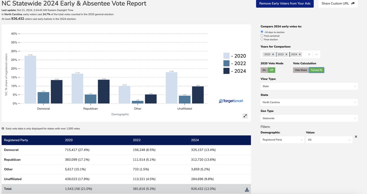 Taken at a high level, the early vote data in NC would appear to be very good for the GOP. At this point in 2020 the EV was +22 Dem, and right now it is +1 D. But let's talk about why it's a lot more complicated than that.
