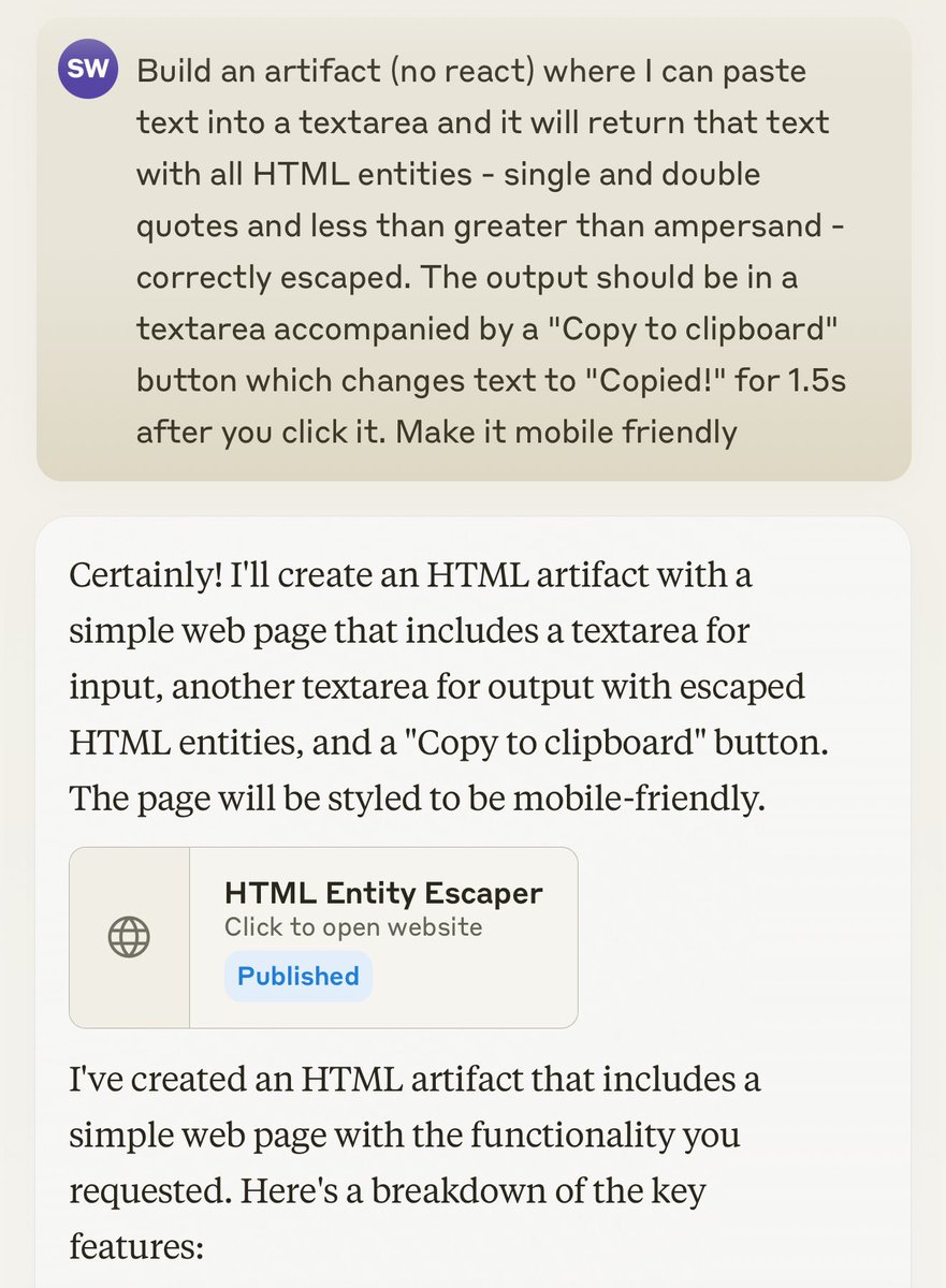 I built 14 interactive mini-apps with Claude Artifacts just in the past seven days - here's a post describing them all simonwillison.net/2024/Oct/21/cl…