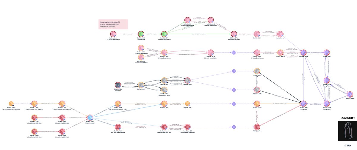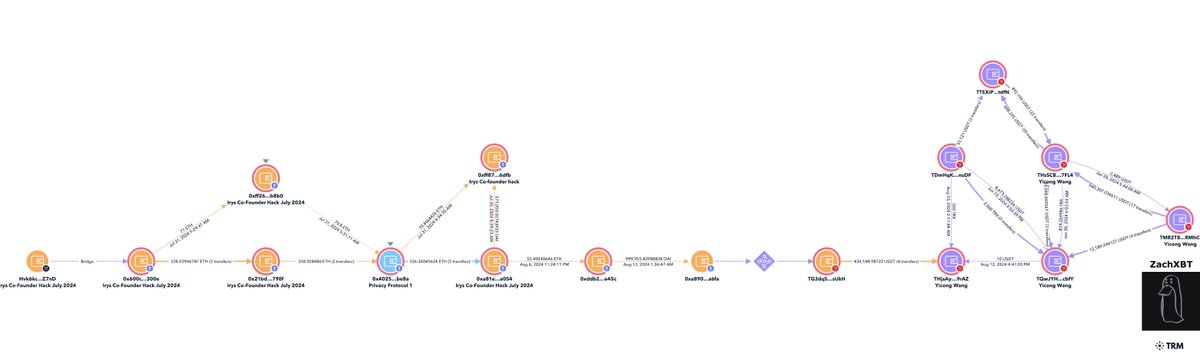 5/ When reviewing blockchain data tied to Yicong Wang you will notice high illicit fund exposure from the Alex Labs, Irys co-founder, and a consolidation of other hacks (EasyFi, Bondly, Maverick co-founder, etc).