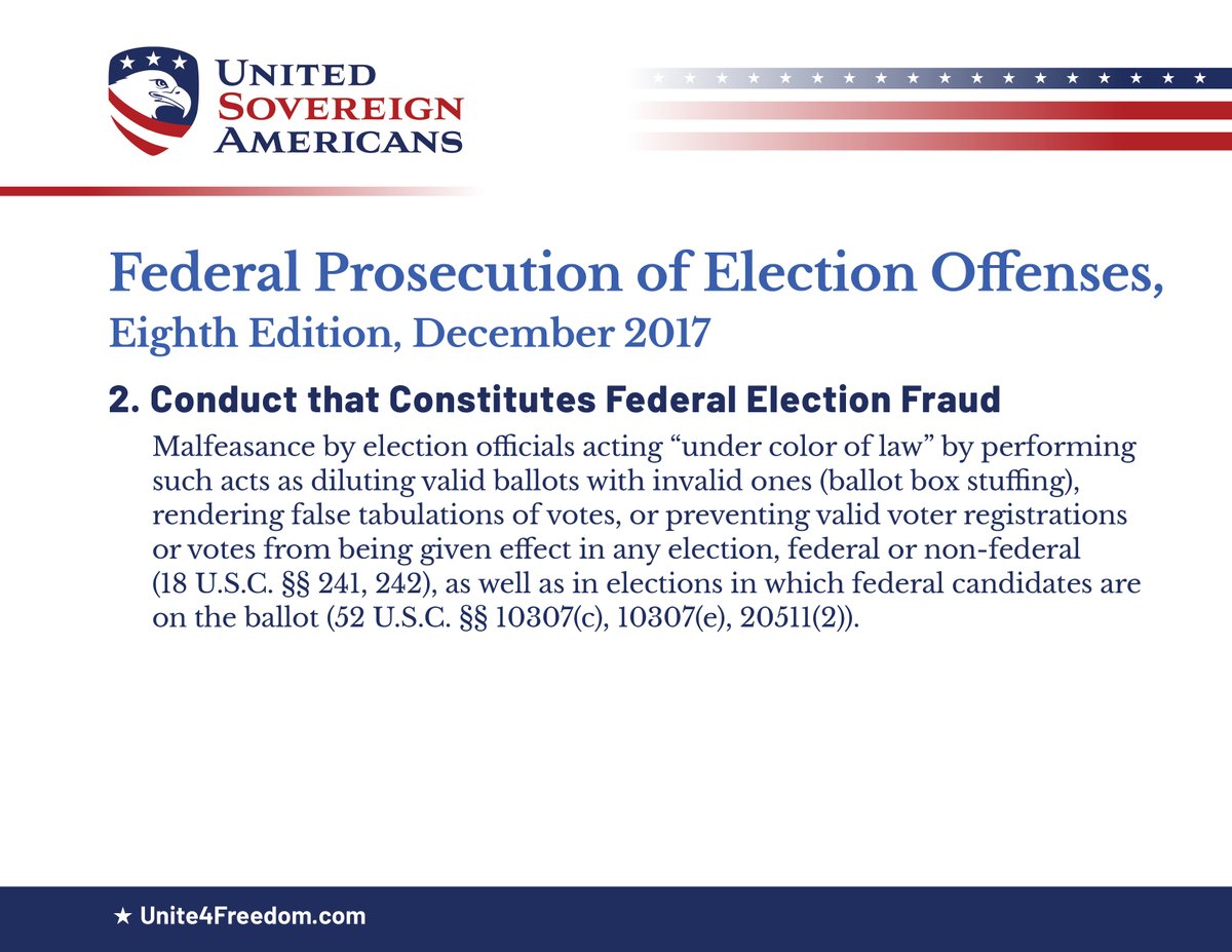 3/ USA is the first organization to measure election misconduct as defined under criminal law, to deeply study Supreme Court precedent, and document the scale of defined election fraud nationwide. After years of law enforcement meetings, official reports, legislative hearings, criminal referrals and staggering trial-ready evidence, massive election fraud is still being illegally certified as accurate. Asking whether election officials are bad people is irrelevant—their job is to prevent fraud, and they are legally required to prove it to us. That’s what we pay them for. Twenty-one Chief Election Officials have been fully briefed, nine have been sued, and every last one has proven disloyal to the sovereign they serve—the American people—and disloyal to the contract we made with our government, the United States Constitution.Image