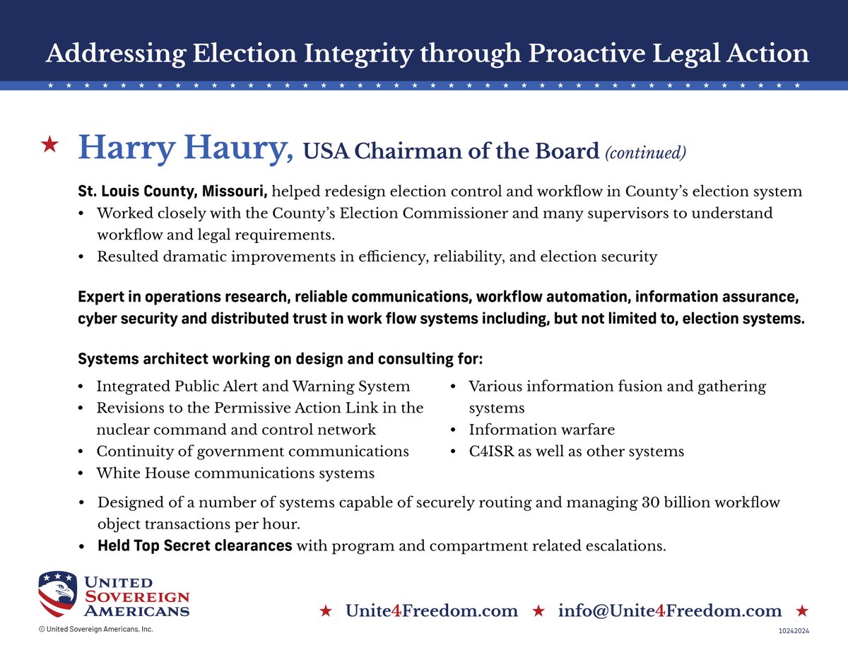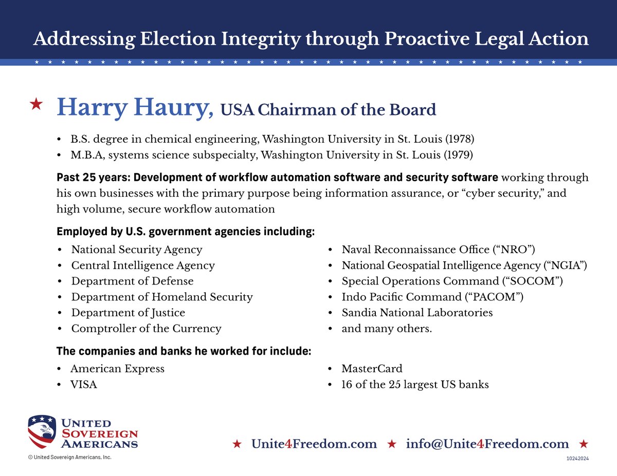 However, they have several problems when referring to the United Sovereign Americans team. One of our co-founders helped write the Help America Vote Act, specifically the elements focused on technology and operational integrity, as a nationally recognized subject-matter expert. We also have lawyers, data analysts, logicians, intelligence community alumni, programmers, forensic investigators, auditors and many others within our group of thousands of credentialed, credible, professional volunteers.Image