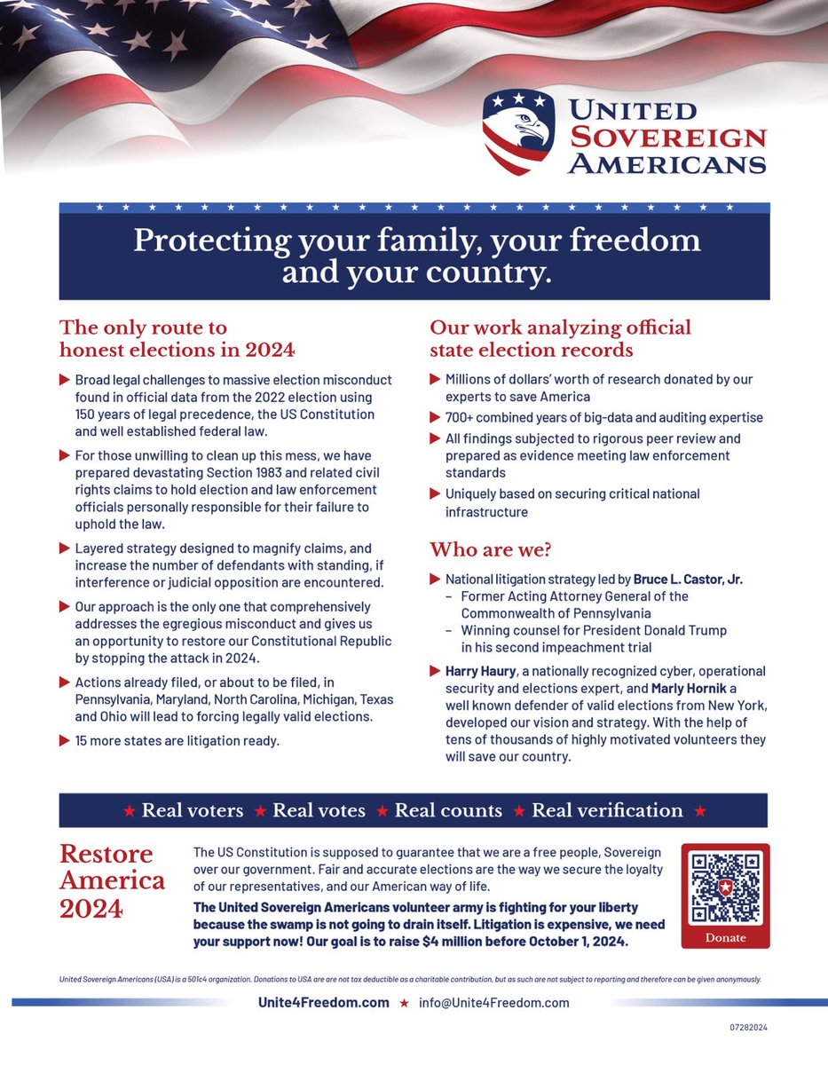 We need you to help USA. We need you to repost this thread, and to volunteer if you can. Top-tier attorneys are expensive, and we need more funding. We can use $5 or $500,000, whatever you can invest in your liberty and our posterity. Find us at Unite4Freedom.com