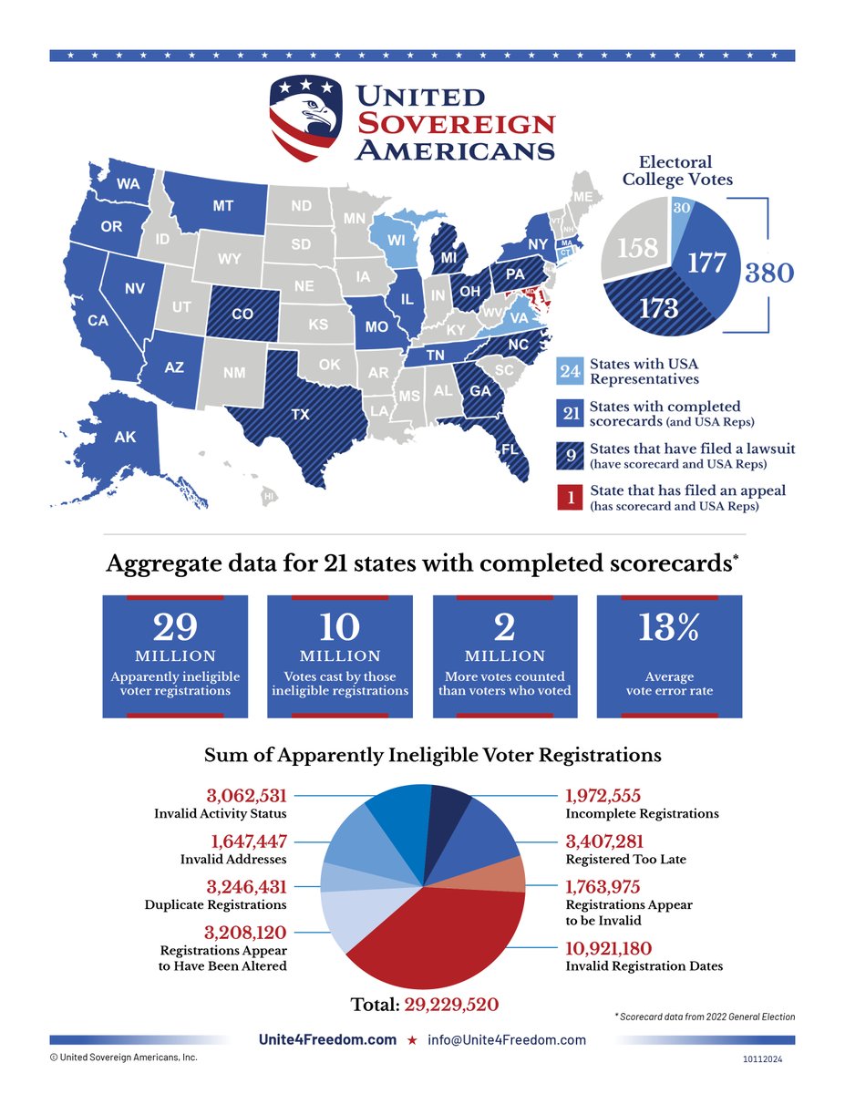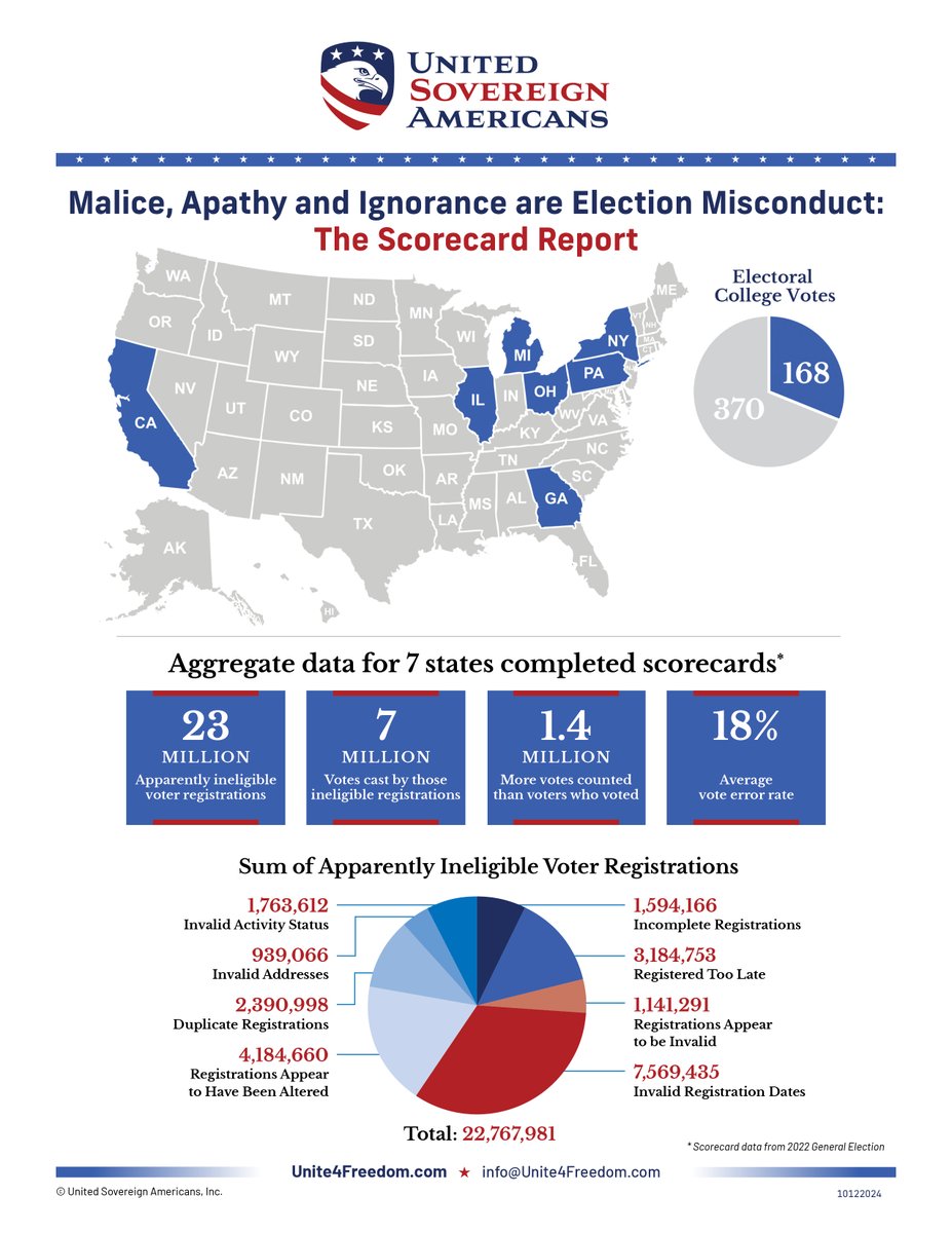 We deeply analyzed 7 states regarding the validity of the four metrics listed above: voters, votes, counts, and reporting accuracy. Those states are Illinois, Michigan, New York, California, Ohio, Pennsylvania, and Georgia, which collectively enjoy 168 Electoral College votes, and control 35% of US Congress. In these 7 states alone United Sovereign Americans found 23 million apparently illegal registrations. 7 million of these voters were allowed to vote in the 2022 midterm. These registrations included duplicate registrations, dead voters, voters that have moved, unverifiable incomplete registrations and many others. The attached slide says it all.