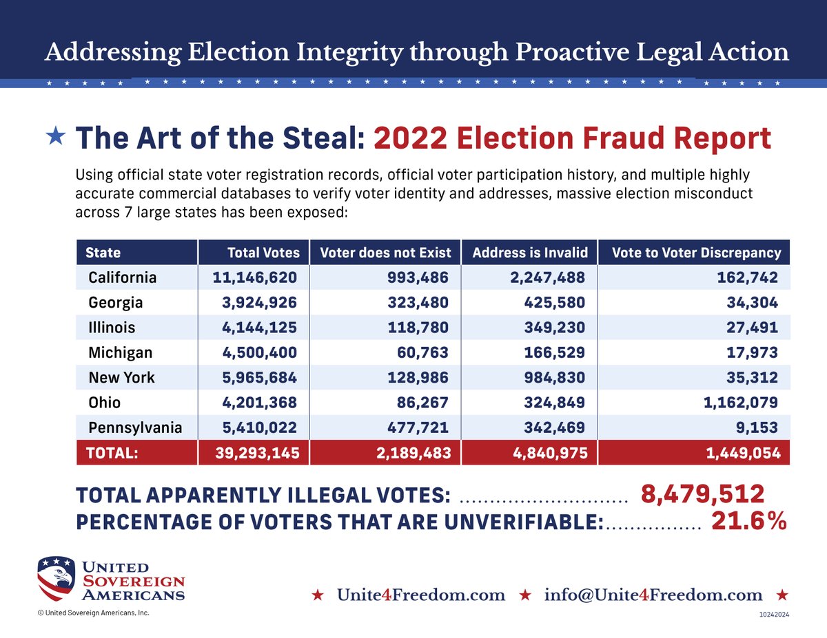 1) The officials and systems that are supposed to be validating voters are blind and have failed. The meaning of an election is an accurate count of individual and aggregate votes from eligible voters. Assertion that the 2024 election can be certified as accurate or compliant is an outright lie, and most likely criminal Election Fraud. Allowing unverifiable voters to vote is illegal when an official does it once; how long will we stand for millions of illegal votes being counted?