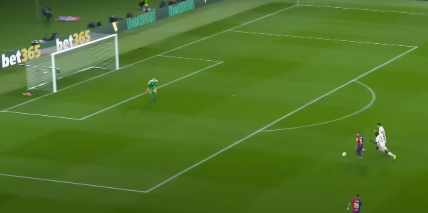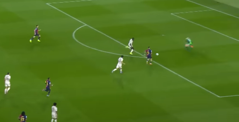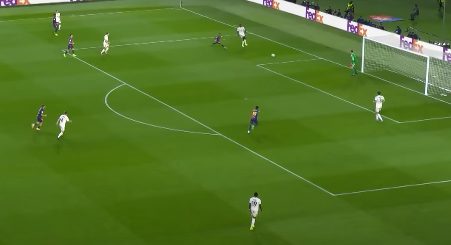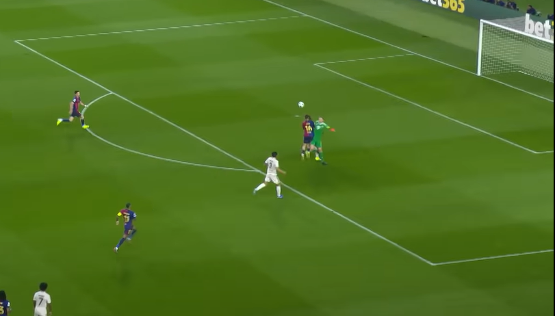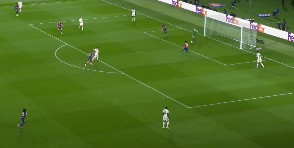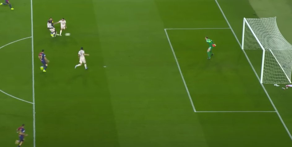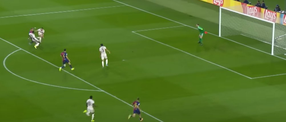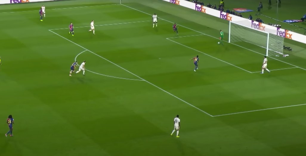 Der Gedanke ist ja richtig die Seite zu wechseln. Aber ohne jegliche Vororientierung & indem man geschlossen zum Ball steht, kann der erste Kontakt nicht über die Schulter gehen. War auch nicht das erste Mal, dass #Barca hoch presste.