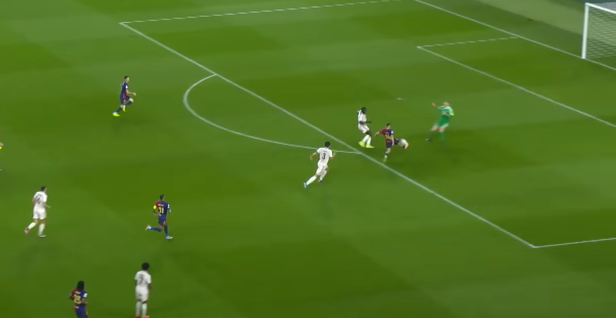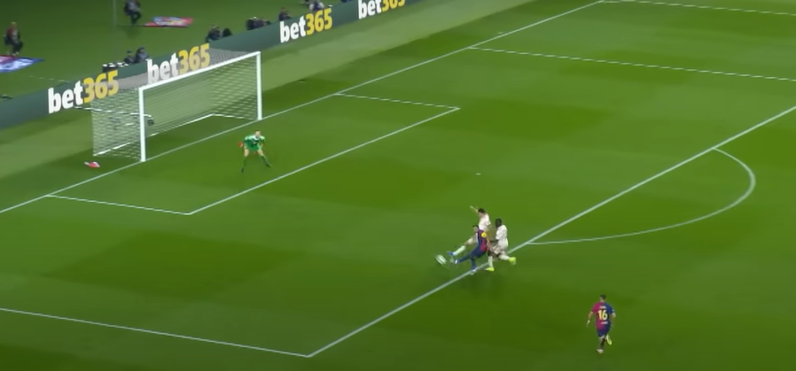 #Zetterer nimmt seine Position viel zu früh ein. #Xavi hat einen sehr langen letzten Kontakt, in der Zeit hätte er noch 1-2 Schritte nach hinten herausholen können. Dadurch steht er im Niemandsland, etwa neun Meter vom Schützen entfernt.